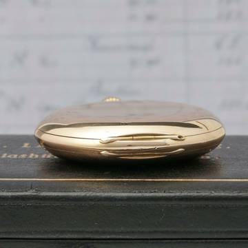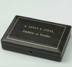 Schweres großes 18k Goldgehäuse in der Form „Lucia“. Deutsche Gold Punzen und die Lange & Söhne Punze in allen Deckeln. Da das Gehäuse keine Schweizer Kontrollpunzen besitzt, handelt es sich sehr wahrscheinlich um ein Glashütter Gehäuse; ein prächtiges und sehr fein verarbeitetes Savonnette-Gehäuse. Keinerlei Inskriptionen. Sowohl das Gehäuse als auch das Werk befinden sich in einem sehr schönen, nahezu neuwertigen Zustand.