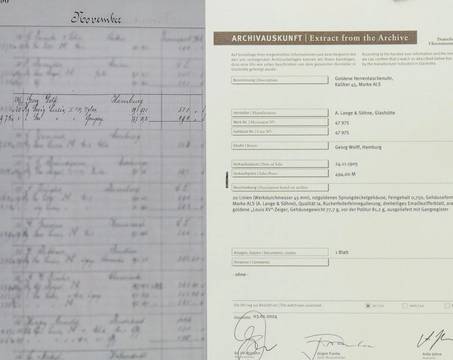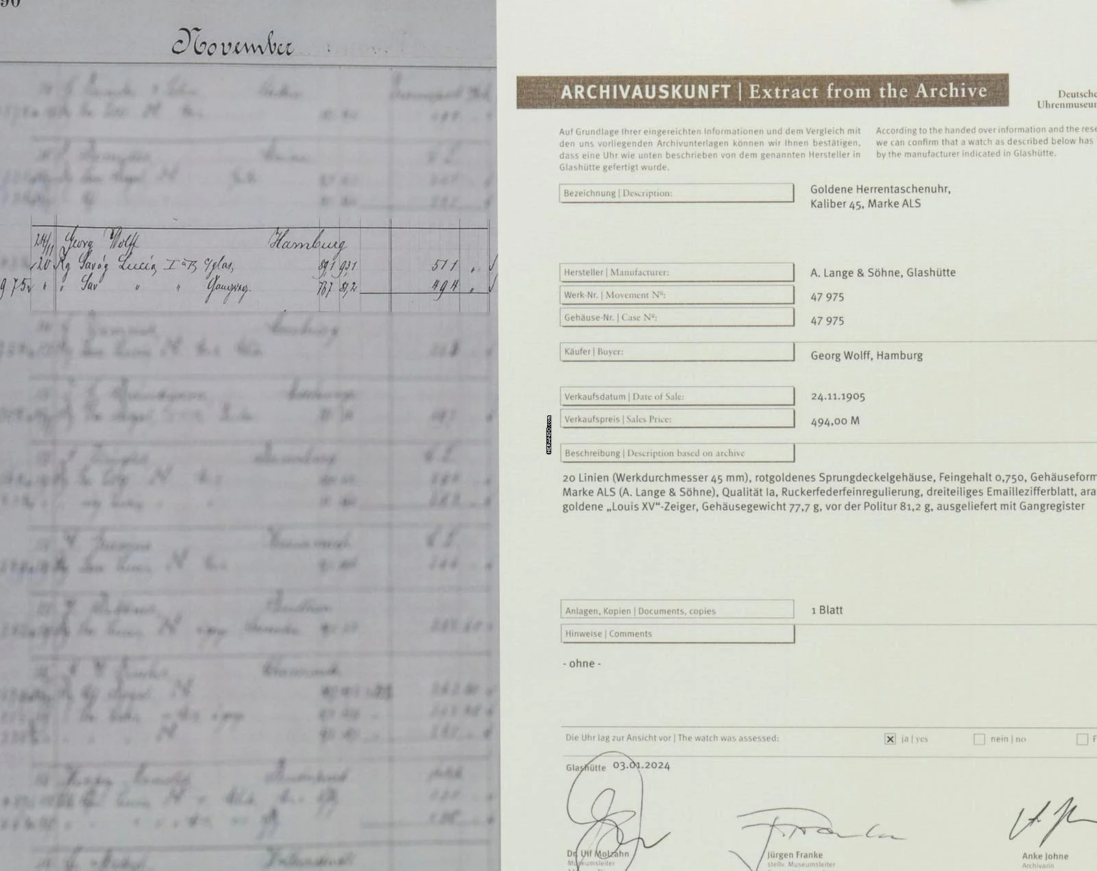 Diameter 55.5mm, weight 135g, cal. 45/20'‘’ lines, movement no. 47 975, case no. 47 975, sold on November 24, 1905, to Georg Wolff, Hamburg, for 494 Reichsmarks.