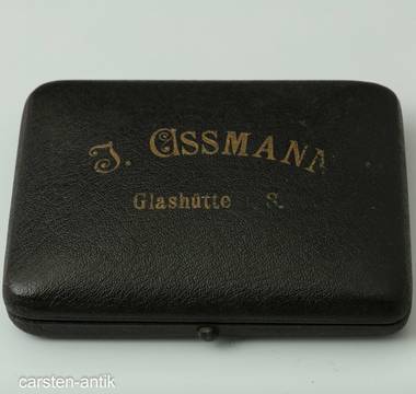 Exquisite split 3/4 plate movement, 21 jewels – five of which are in screwed gold chatons. Cal. 43/19'‘’ lines, quality 1A, condition like new, grained and gold-plated, Glashütte compensation balance with gold screws. Rare snail-shaped fine adjustment. Diamond endstone in gold lining on the balance staff. Engraved balance bridge, steel moustache anchor escapement and escape wheel, red gold running train, polished screws. Double sunburst finish on the ratchet wheels according to Großmann. Crown winding. Signed “J. Assmann Glashütte i/s,” engraved with “Dresden” on the edge of the sub-plate. The movement is in mint condition and runs perfectly. The amplitude is very accurate, with a deviation of 0 seconds in 24 hours.