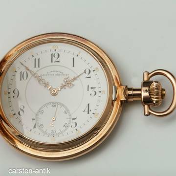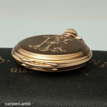 Hochfeines, gestuftes „Louis XV“ 14k Gold Gehäuse. Beide Deckel sind guillochiert. In den Deckeln sind die Manufaktur- und die deutschen Goldpunzen. Abgesehen von diesen Punzierungen hat das Gehäuse keinerlei Gravuren. Das Monogramm „FL“ wurde - wie auch die Guillochierung - gestochen. Alle Deckel schließen perfekt; das hochwertige Gehäuse befindet sich in schönem Zustand, die einzig nennenswerten Gebrauchsspuren sind zwei sehr kleine Druckstellen an der Cuvette.