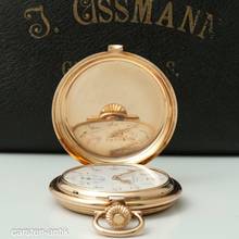 Three-piece enamel dial, signed “J. Assmann Glashütte i/ Sachsen”. Recessed subsidiary seconds; black Arabic numerals, golden minute numerals, magnificent original Louis XV gold hands. The dial and hands are in excellent condition.