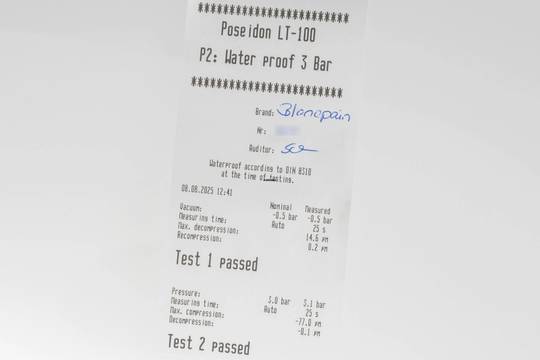 * Wenn die Uhr positiv auf Wasserdichtigkeit getestet wurde, dann gilt diese Eigenschaft zum Zeitpunkt der Messung. Wasserdichtigkeit ist nach DIN 8310 keine bleibende Eigenschaft. Sie sollte jährlich und vor besonderen Belastungen überprüft werden, da die eingebauten Dichtelemente in ihrer Funktion und im täglichen Gebrauch nachlassen. Einflüsse wie starke Temperaturschwankungen, Chlor, Seife oder Salzwasser wirken sich negativ auf die Wasserdichtigkeit aus.