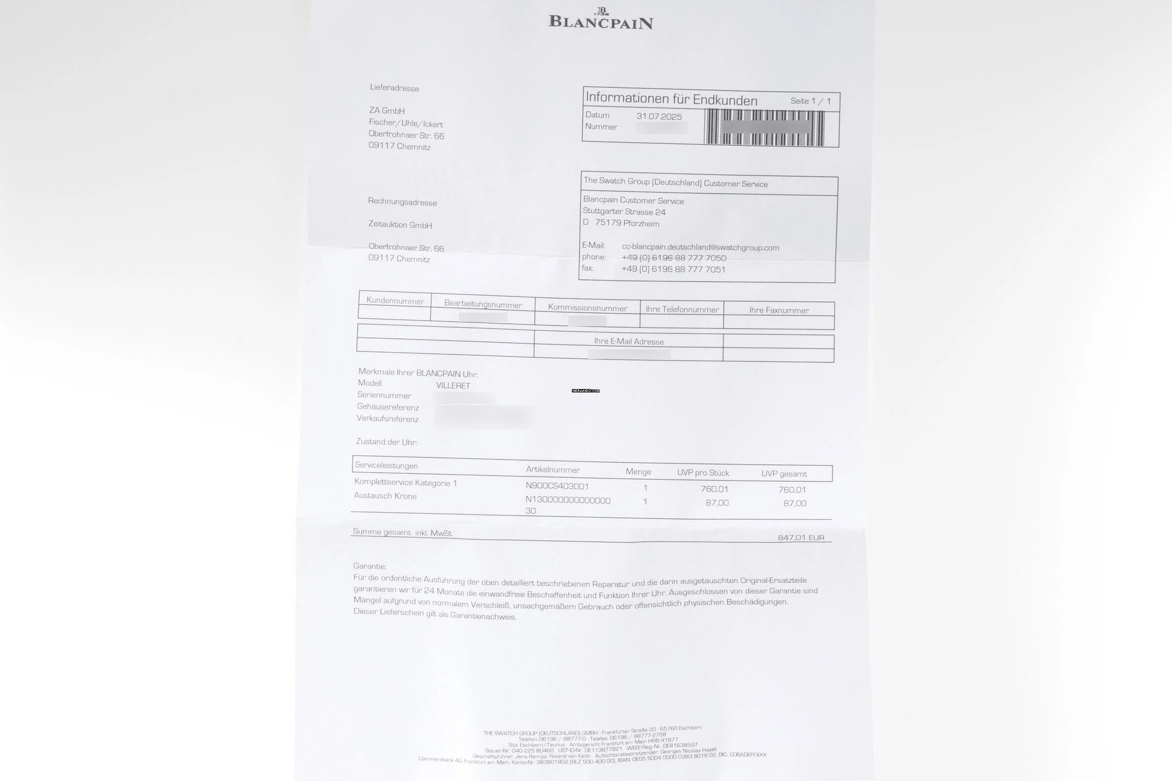 Service beim Hersteller in 07/2025 incl. Austausch der Krone