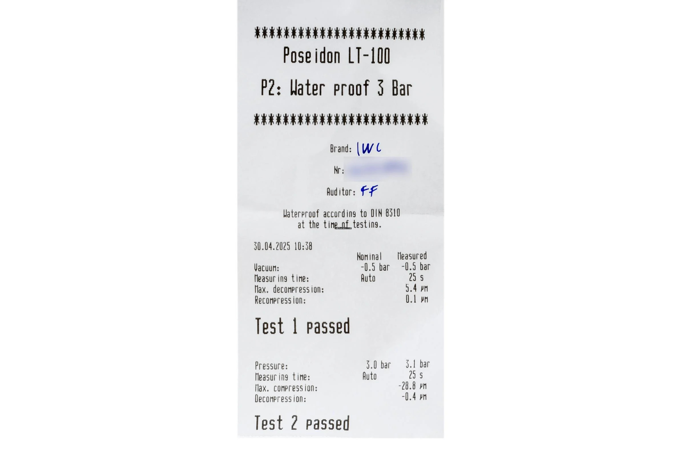 * Wenn die Uhr positiv auf Wasserdichtigkeit getestet wurde, dann gilt diese Eigenschaft zum Zeitpunkt der Messung. Wasserdichtigkeit ist nach DIN 8310 keine bleibende Eigenschaft. Sie sollte jährlich und vor besonderen Belastungen überprüft werden, da die eingebauten Dichtelemente in ihrer Funktion und im täglichen Gebrauch nachlassen. Einflüsse wie starke Temperaturschwankungen, Chlor, Seife oder Salzwasser wirken sich negativ auf die Wasserdichtigkeit aus.