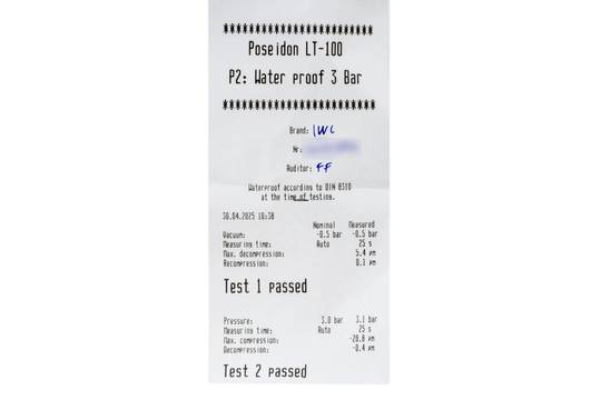 - Wasserdichtigkeit*: ja. Das Prüfprotokoll mit Prüfdruckangabe liegt bei.
