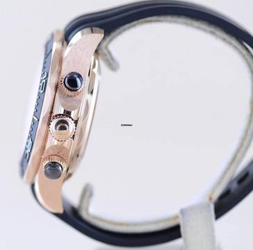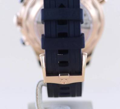 Montiert ist das schwarze Kautschukband mit schöner massiver Dornschließe in Sednagold.