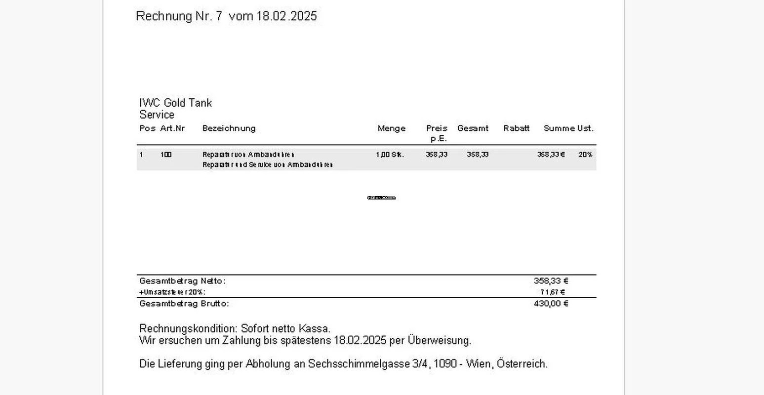 - FAIR TRANSACTION: Is important to us. We sell all of our watches in a condition and for a price that we would wish to receive if our positions were reversed, with us being our own customer. We have sold over 700 (!) watches on Herando so far with an excellent customer feedback rating. You can review our Herando customer feedbacks by clicking onto the "blue reviews button" right beside the picture galery.