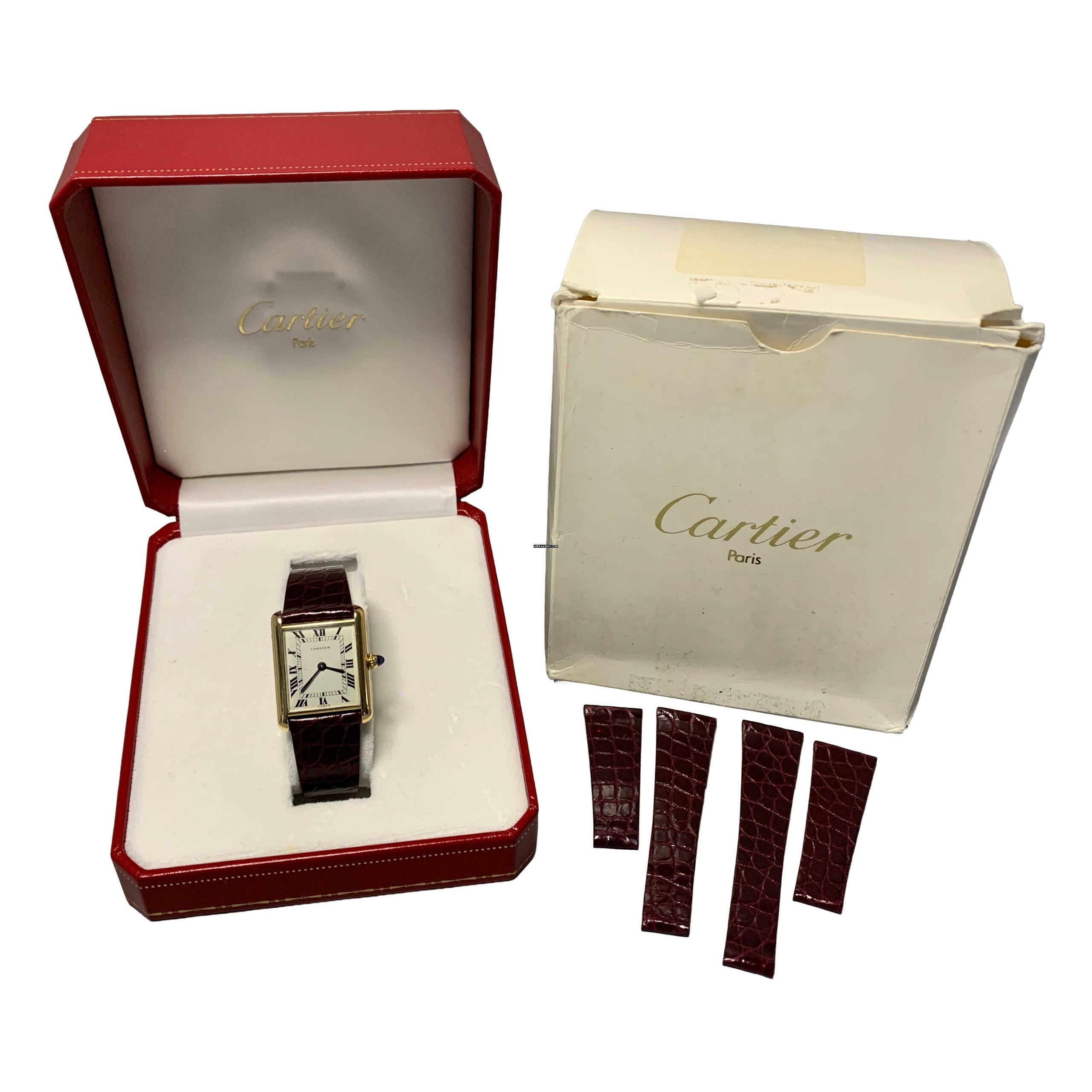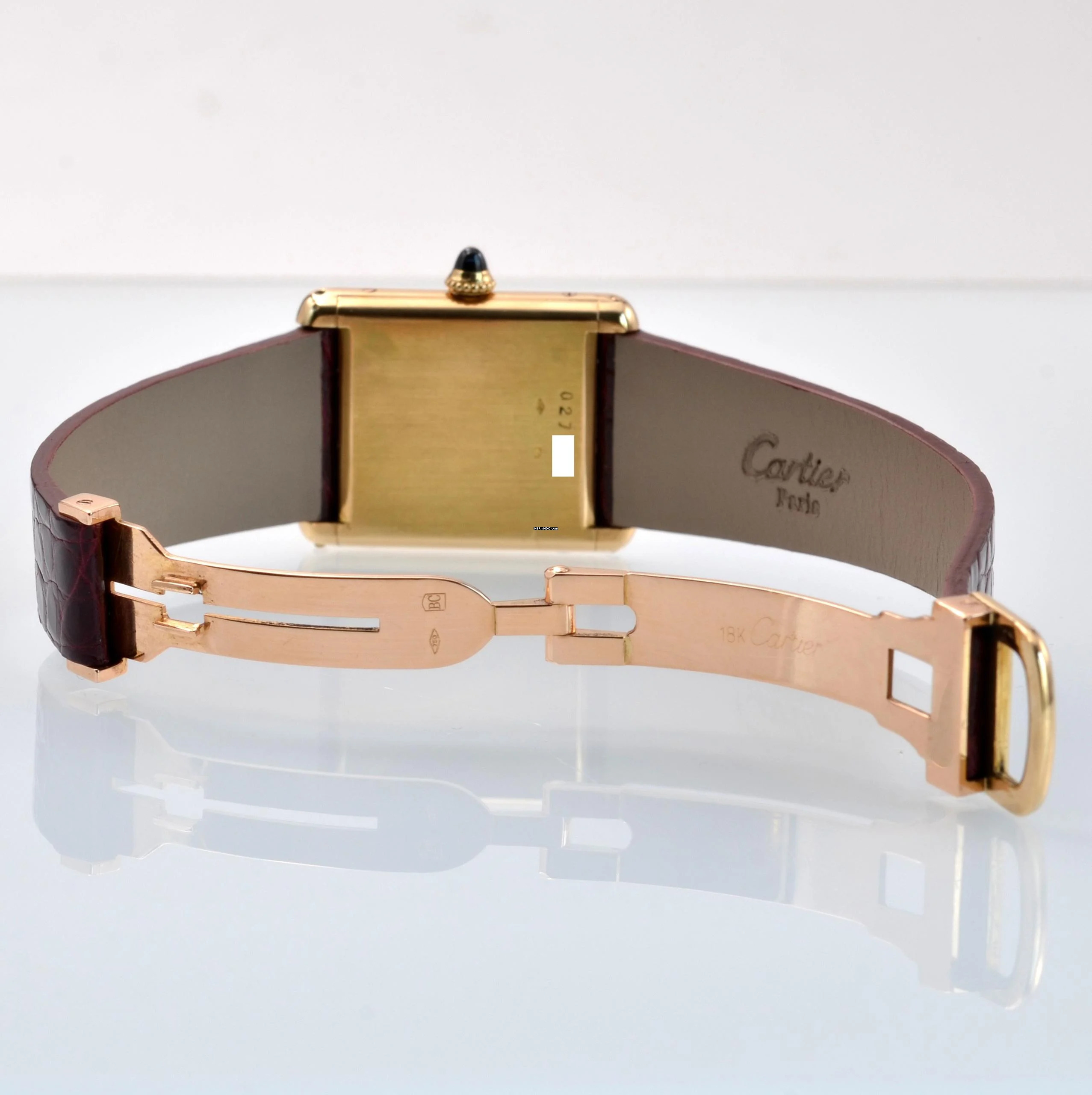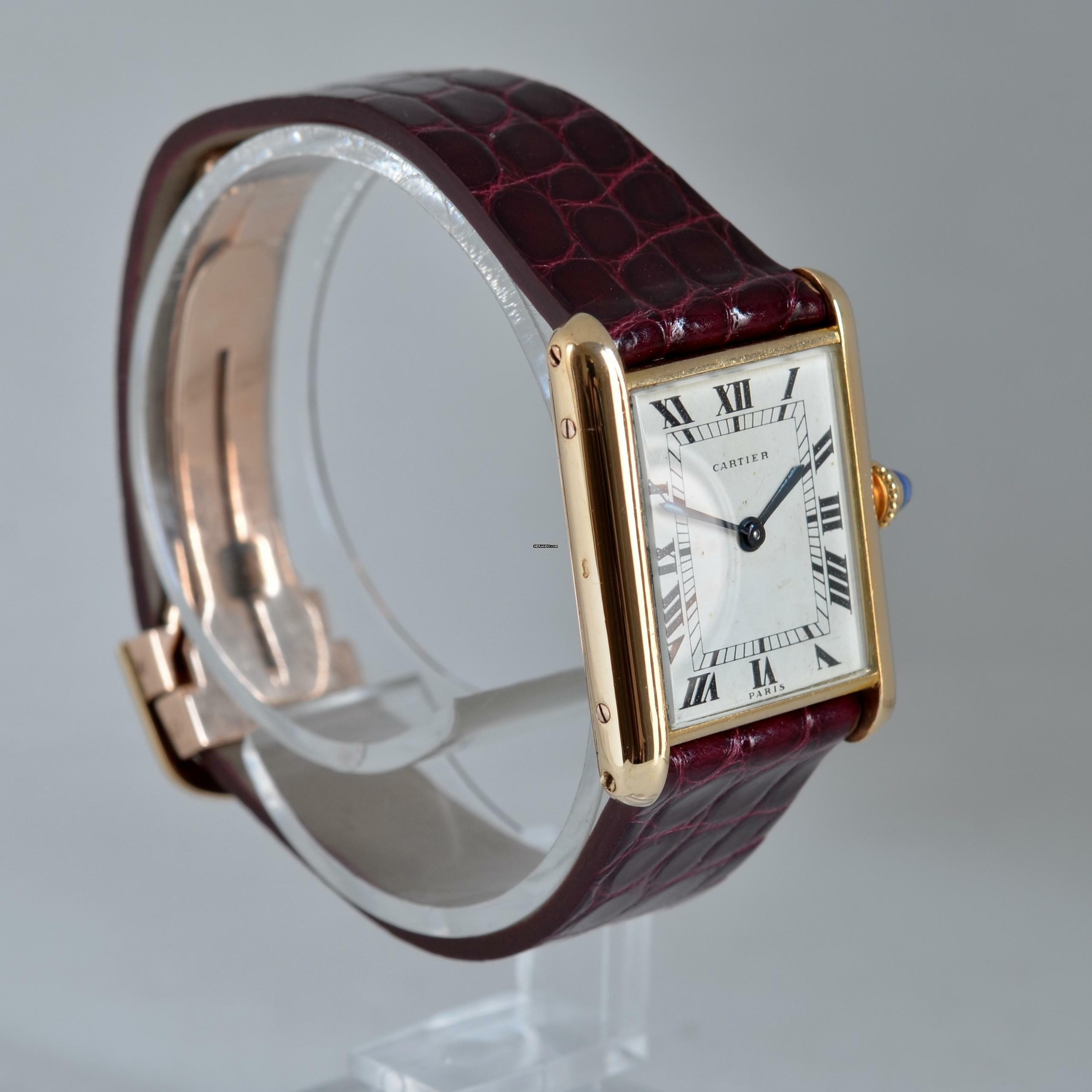 Cartier Tank Louis Cartier ultra-thin production first series of Paris in yellow gold 18KT, year of production 1971, mineral glass of the epoch, ivory colour enamel dial with Romans indexes, manual winding Cartier movement of base caliber of Jaeger LeCoultre, shiny burgundy colour alligator watch strap with gold 18KT deployante closure original Cartier of the epoch.