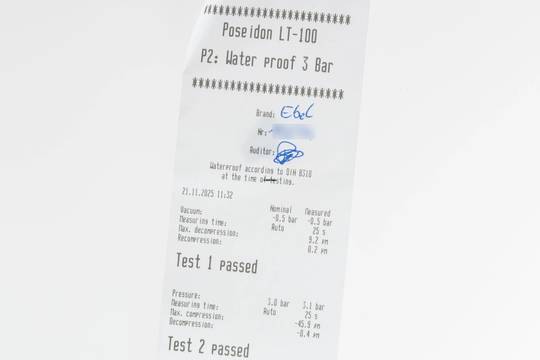 - Wasserdichtigkeit*: ja. Das Prüfprotokoll mit Prüfdruckangabe liegt bei.