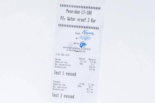 * Wenn die Uhr positiv auf Wasserdichtigkeit getestet wurde, dann gilt diese Eigenschaft zum Zeitpunkt der Messung. Wasserdichtigkeit ist nach DIN 8310 keine bleibende Eigenschaft. Sie sollte jährlich und vor besonderen Belastungen überprüft werden, da die eingebauten Dichtelemente in ihrer Funktion und im täglichen Gebrauch nachlassen. Einflüsse wie starke Temperaturschwankungen, Chlor, Seife oder Salzwasser wirken sich negativ auf die Wasserdichtigkeit aus.