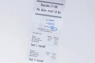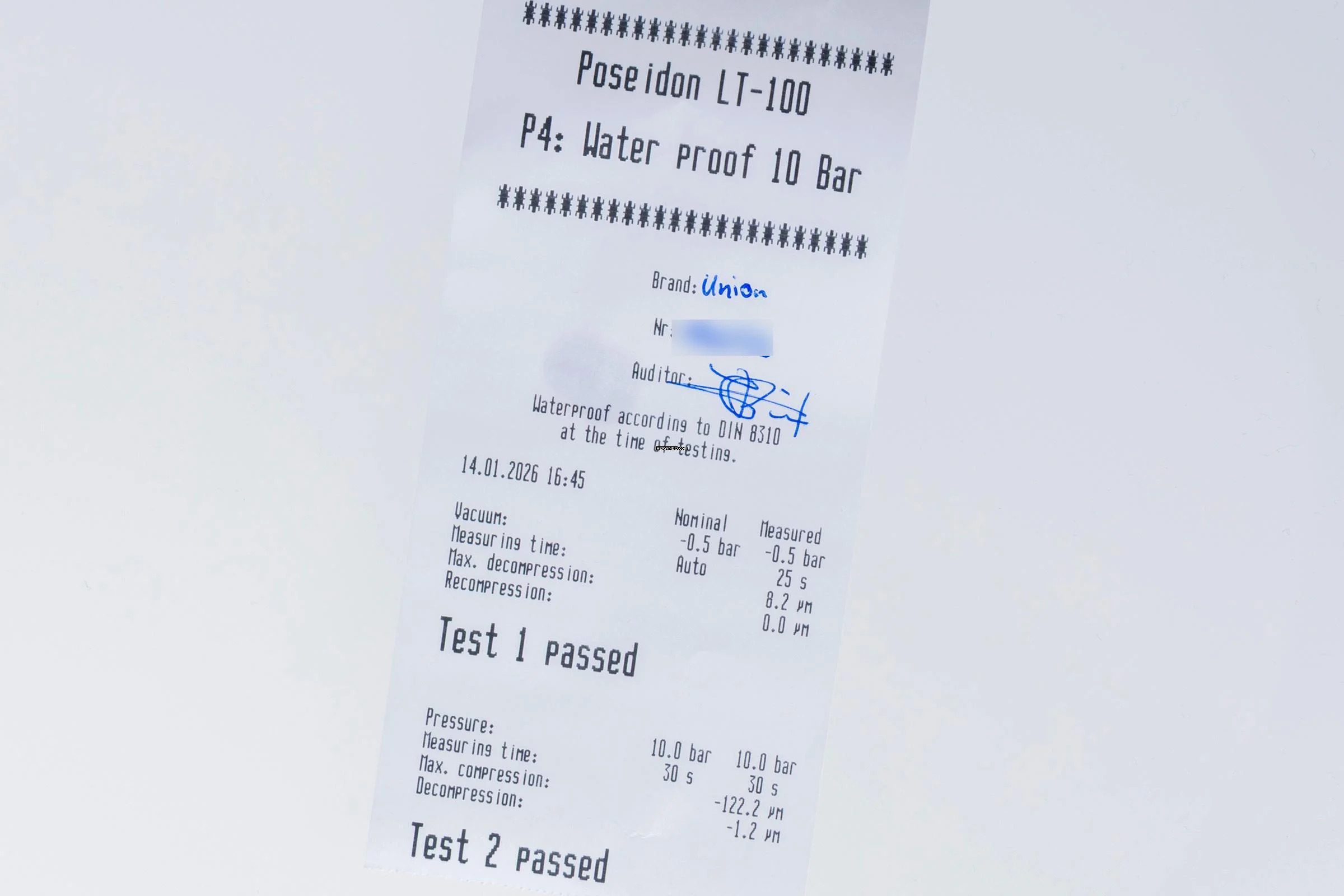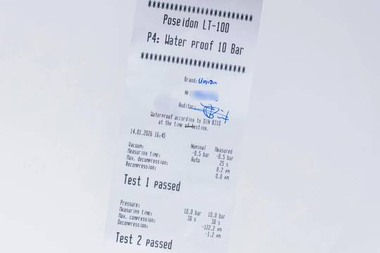 * Wenn die Uhr positiv auf Wasserdichtigkeit getestet wurde, dann gilt diese Eigenschaft zum Zeitpunkt der Messung. Wasserdichtigkeit ist nach DIN 8310 keine bleibende Eigenschaft. Sie sollte jährlich und vor besonderen Belastungen überprüft werden, da die eingebauten Dichtelemente in ihrer Funktion und im täglichen Gebrauch nachlassen. Einflüsse wie starke Temperaturschwankungen, Chlor, Seife oder Salzwasser wirken sich negativ auf die Wasserdichtigkeit aus.