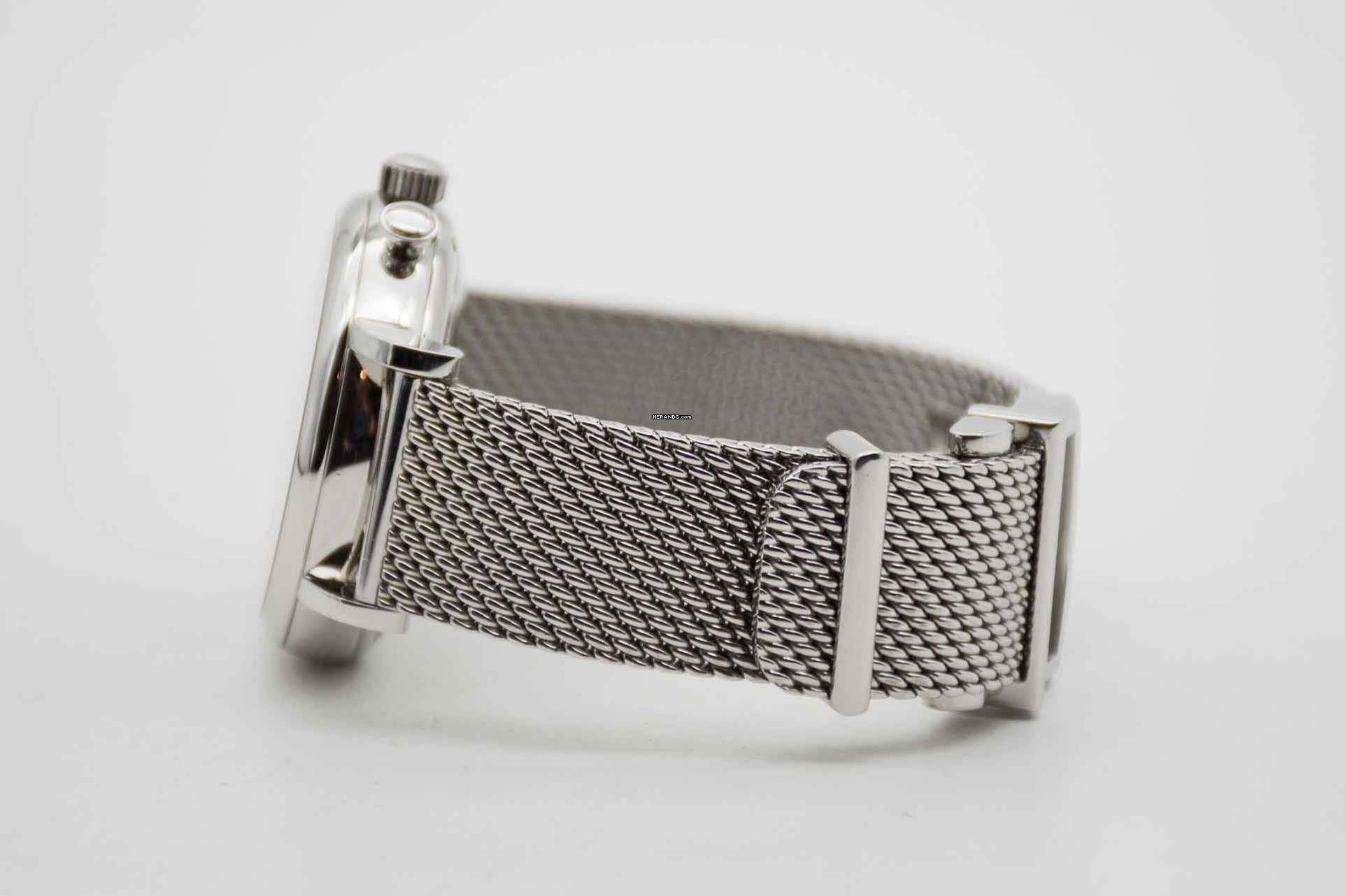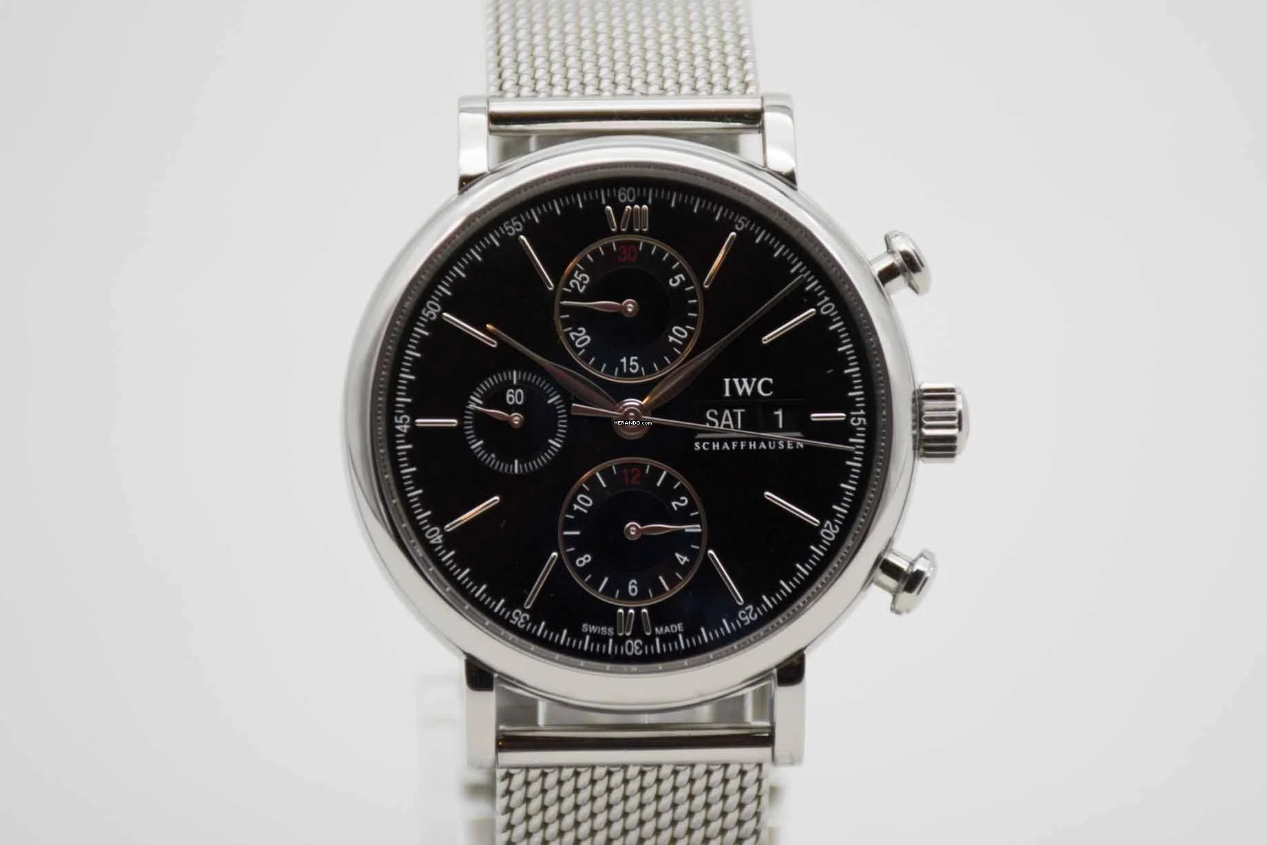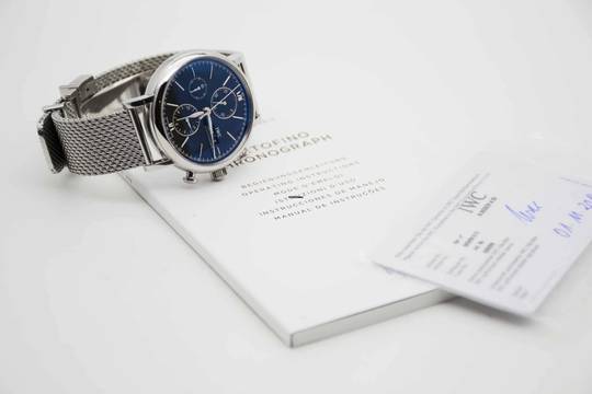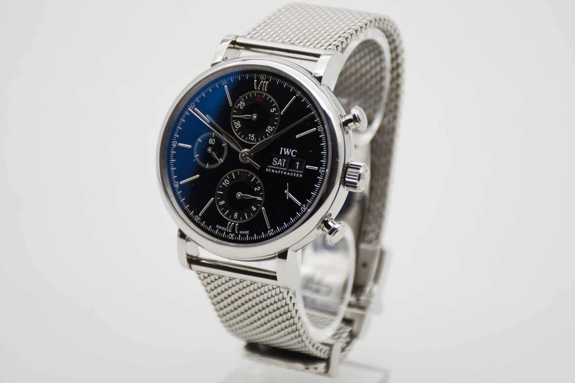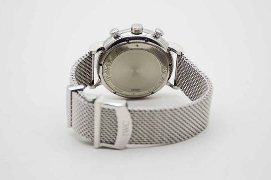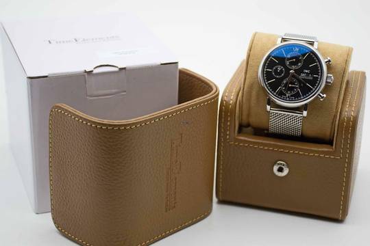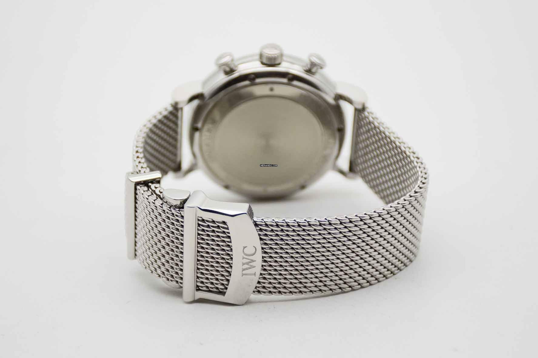 Portofino Chronograph IW391010, 42 mm case with black dial and adjustable IWC mesh bracelet. This very elegant dress watch comes with IWC Portofino Chronograph manual, original IWC warranty card (delivered in Germany in 2014) and our TE vintage watch cube. This Portofino is freshly serviced and is in perfect and mint condition like new.