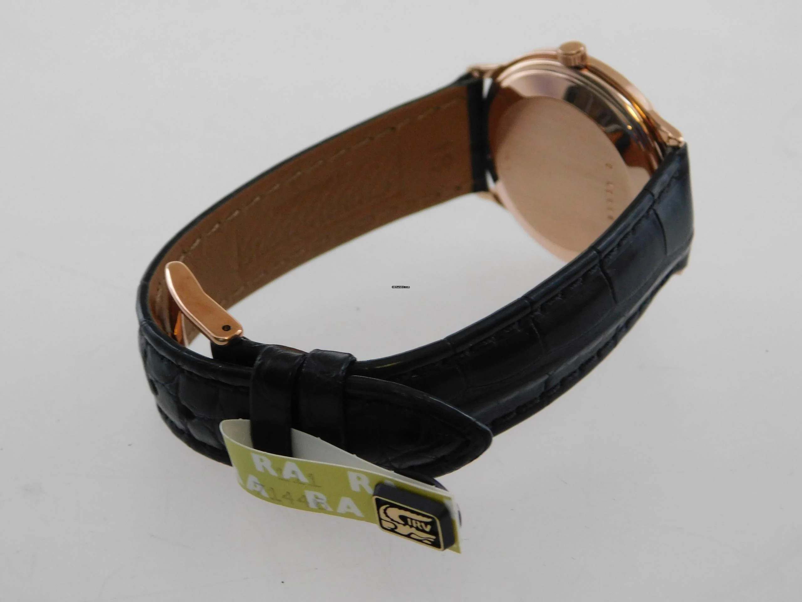Die Uhr hat ein neues schwarzes Echt Kroko Lederband mit neutraler Schließe