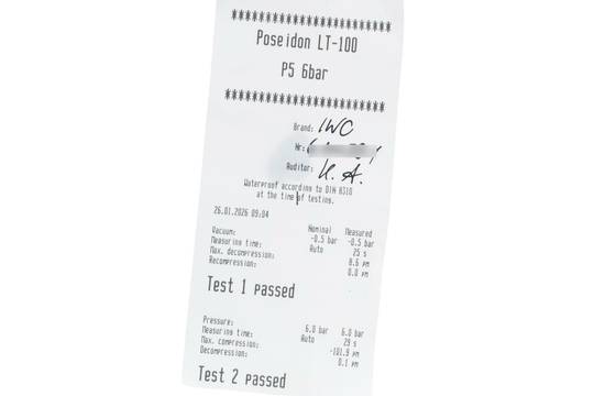 * Wenn die Uhr positiv auf Wasserdichtigkeit getestet wurde, dann gilt diese Eigenschaft zum Zeitpunkt der Messung. Wasserdichtigkeit ist nach DIN 8310 keine bleibende Eigenschaft. Sie sollte jährlich und vor besonderen Belastungen überprüft werden, da die eingebauten Dichtelemente in ihrer Funktion und im täglichen Gebrauch nachlassen. Einflüsse wie starke Temperaturschwankungen, Chlor, Seife oder Salzwasser wirken sich negativ auf die Wasserdichtigkeit aus.
