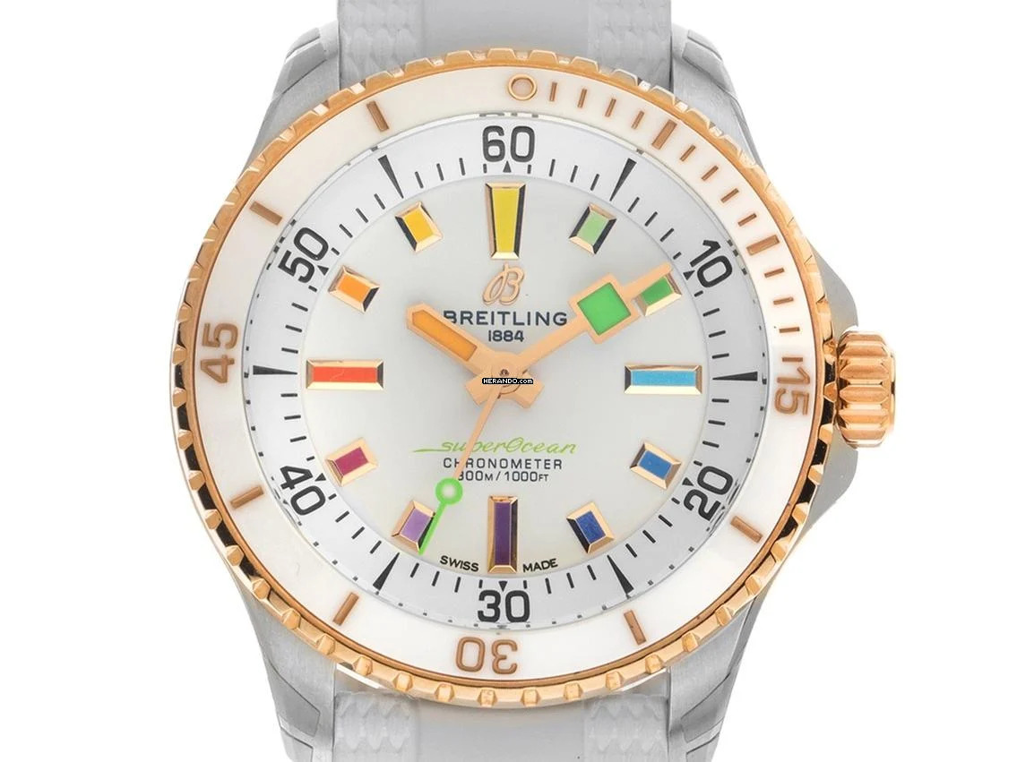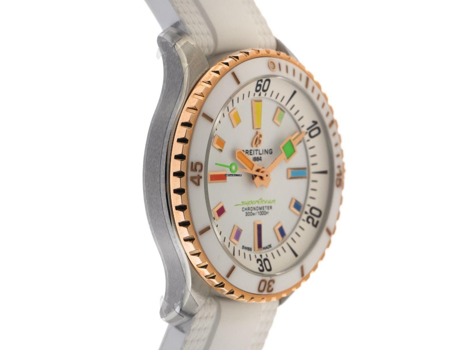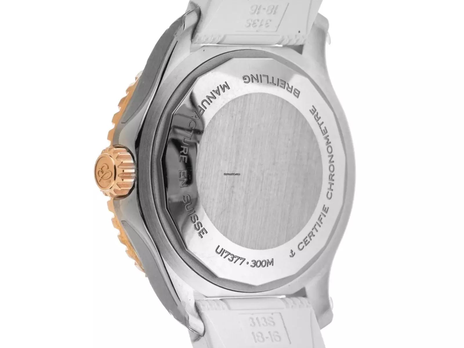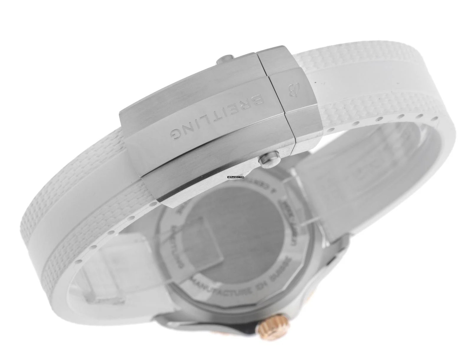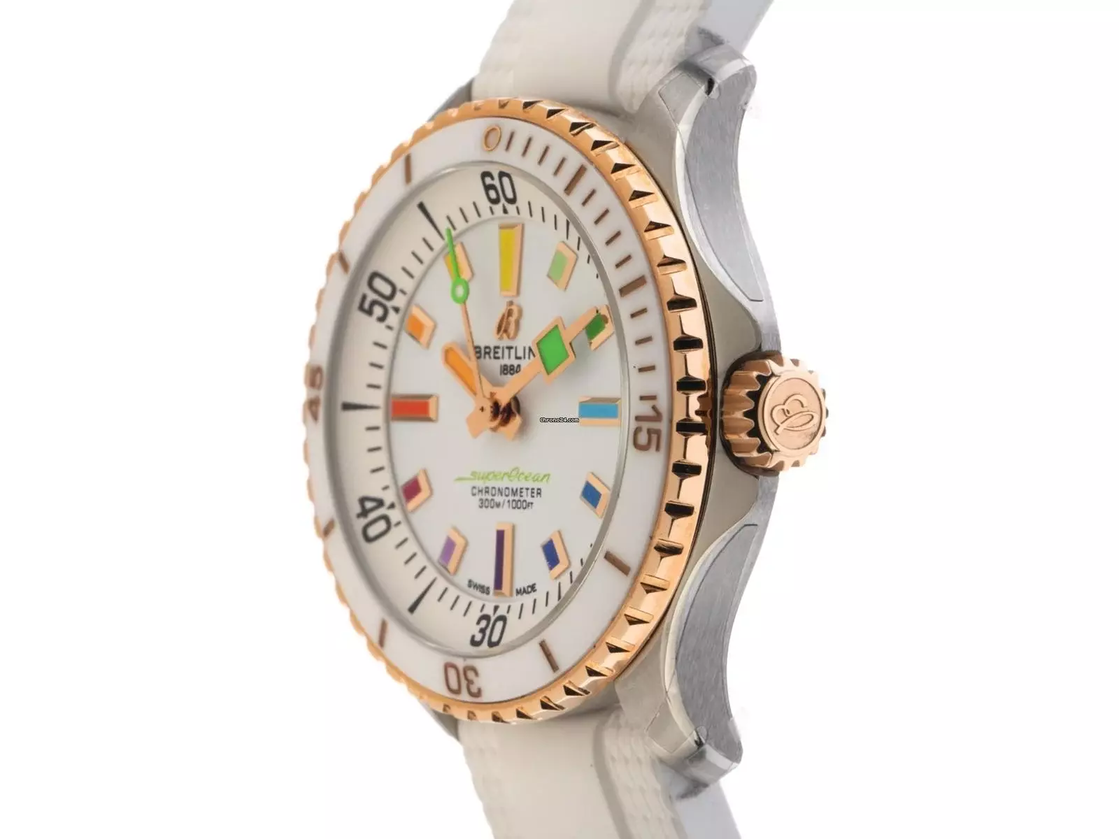 Breitling Superocean Stahl 18kt Rotgold Automatik Armband Kautschuk Faltschließe Gehäuse Edelstahl poliert und satiniert, Gehäusedurchmesser ohne Krone 36mm, Gehäusehöhe 12,2mm. Lünette 18kt Rotgold geriffelt mit weißem Inlay und 60-Minuten Skala, einseitig drehbar. Armband Kautschuk weiß, Anstoßbreite 18mm, Sicherheitsfaltschließe Edelstahl mit Hersteller-Logo. Zifferblatt weiß mit bunten Leuchtindexen und rotgoldenen Leuchtzeigern. Uhrwerk Automatik, Chronometer mit Zeugnis, Kaliber Breitling 17 mit 26 Edelsteinen, Gangreserve ca. 38 Stunden. Anzeige von Stunde, Minute und Sekunde über Zeiger aus der Mitte mit Sekundenstopp zur sekundengenauen Einstellung der Uhrzeit. Saphirglas kratzfest, doppelseitig entspiegelt und bombiert. Krone verschraubbar mit Flankenschutz und Hersteller-Logo. Boden Edelstahl verschraubt und graviert. Gewicht der Uhr inklusive Armband 103g. Wasserdicht bis 30 ATM. Referenznummer: U17377211A1S1, ID: ST116099400226H-7350, Artikelnummer: 10000084670. Original Breitling Box und Garantie Papiere von 2026, Full Set. Ungetragen. Lieferzeit sofort. Inklusive Uhrenpass mit einem Farbbild, der genauen Beschreibung sowie dem Wiederbeschaffungswert der Uhr über 7350,-€ und 1000 Tage Garantie ab Kaufdatum.
