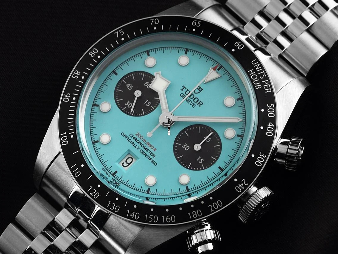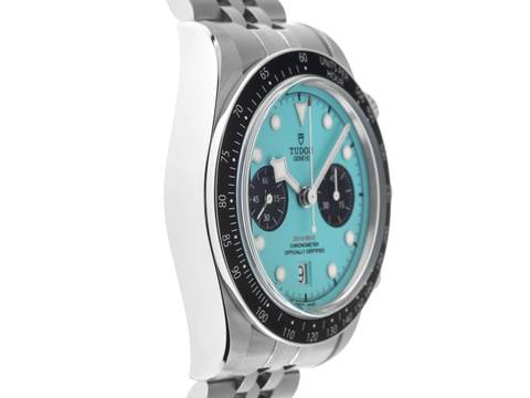 Tudor Black Bay Chronograph Stahl Automatik Chronograph Armband Stahl Gehäuse Edelstahl poliert und satiniert, Gehäusedurchmesser ohne Krone 41mm, Gehäusehöhe 14,4mm. Lünette Edelstahl mit schwarzem Inlay und Tachymeterskala. Armband Edelstahl poliert und satiniert, Sicherheitsfaltschließe Edelstahl mit Hersteller-Logo. Zifferblatt türkis mit aufgesetzten Leuchtindexen und Edelstahl Leuchtzeigern sowie schwarzen Hilfszifferblättern. Uhrwerk Automatik, Chronograph, Chronometer mit Zeugnis (COSC), Kaliber Tudor MT5813, Gangreserve ca. 70 Stunden. Anzeige von Stunde und Minute über Zeiger aus der Mitte, kleine Sekunde mit Sekundenstopp zur sekundengenauen Einstellung der Uhrzeit bei 9 Uhr, Datumsanzeige mit Schnellverstellung bei 6 Uhr. Saphirglas kratzfest. Krone verschraubbar mit Hersteller-Logo, Chronographen Drücker verschraubbar. Boden Edelstahl verschraubt und graviert. Gewicht der Uhr inklusive Armband 166g, Länge des Armbandes inklusive Gehäuse 180mm. Wasserdicht bis 20 ATM. Referenznummer: M79360N-0024, ID: P2469160000226H-13900/6230, Artikelnummer: 10000084707. Original Tudor Box mit Umkarton und Garantie Papiere von September 2025 sowie Beschreibung und Watchregister Auszug von Februar 2026, The Watch Register Zertifikat / ohne Eintrag (Internationale Datenbank für verlorene oder gestohlene Uhren), Full Set. Ungetragen. Lieferzeit sofort. Inklusive Uhrenpass mit einem Farbbild, der genauen Beschreibung sowie dem Wiederbeschaffungswert der Uhr über 13900,-€ und 1000 Tage Garantie ab Kaufdatum.