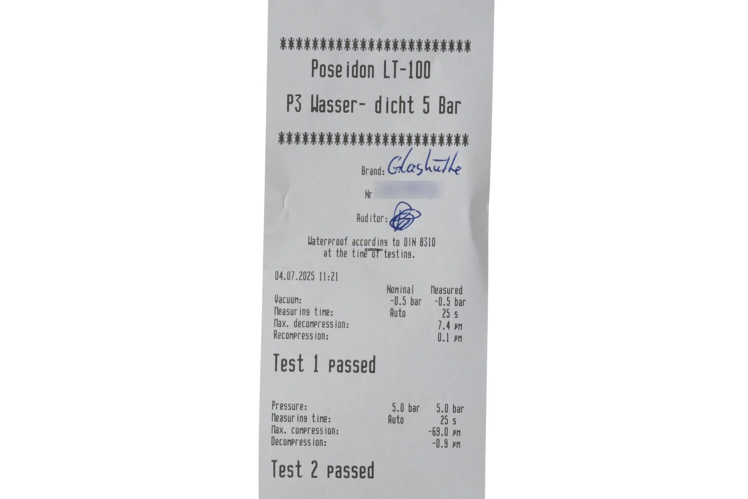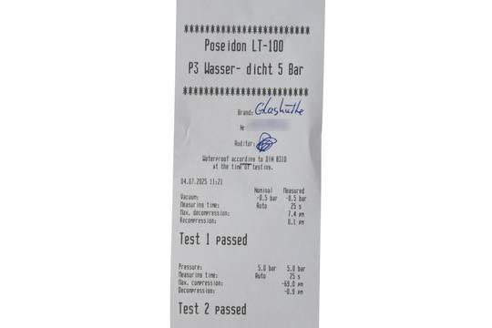 * Wenn die Uhr positiv auf Wasserdichtigkeit getestet wurde, dann gilt diese Eigenschaft zum Zeitpunkt der Messung. Wasserdichtigkeit ist nach DIN 8310 keine bleibende Eigenschaft. Sie sollte jährlich und vor besonderen Belastungen überprüft werden, da die eingebauten Dichtelemente in ihrer Funktion und im täglichen Gebrauch nachlassen. Einflüsse wie starke Temperaturschwankungen, Chlor, Seife oder Salzwasser wirken sich negativ auf die Wasserdichtigkeit aus.