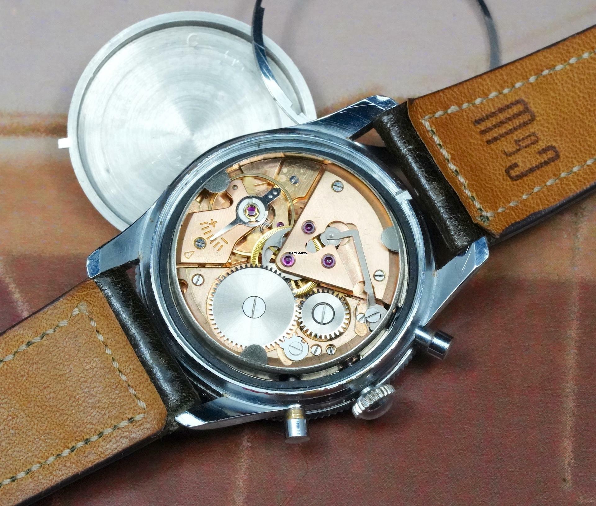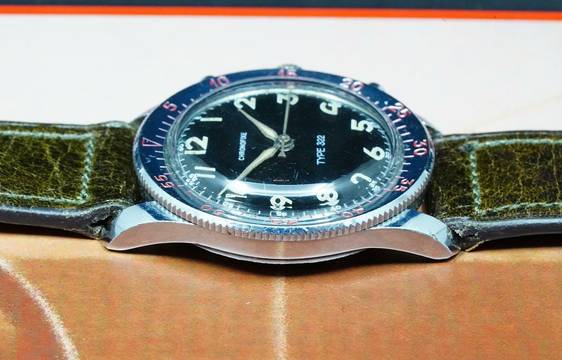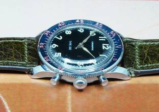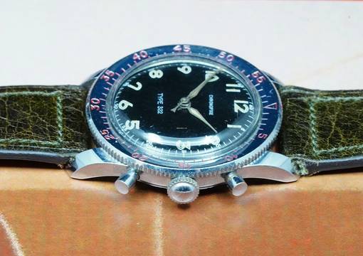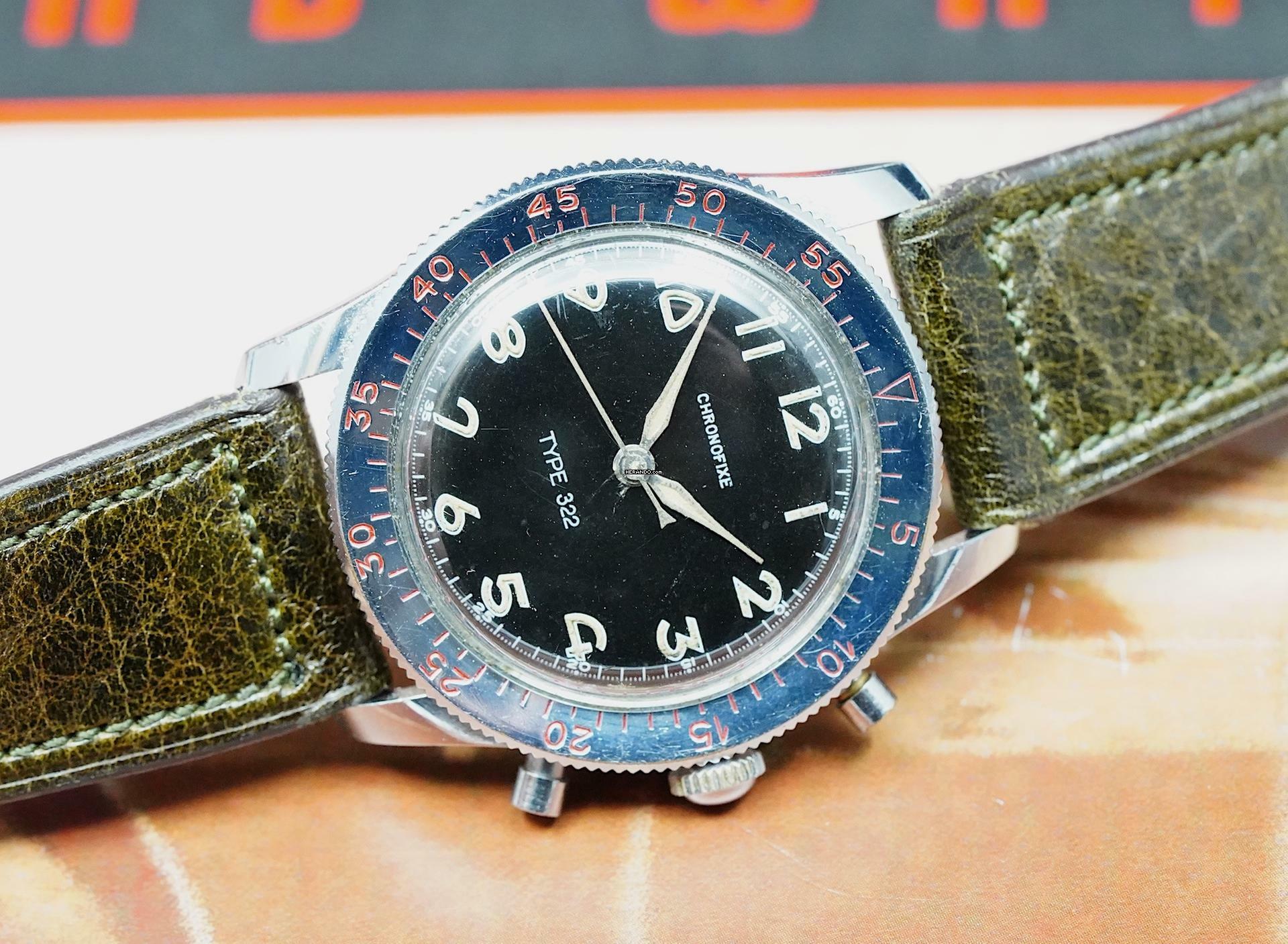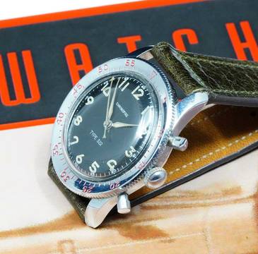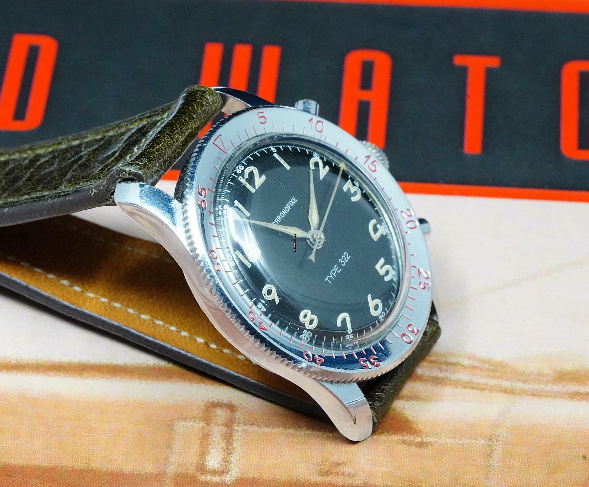 If you're looking for something rare, look no further! Only one other of these Chronofixe Type 322's can be found on a forum on the net... Chronofixe is a small brand which mainly delivered Flyback chrono's type 20 to the French Airforce. This Type 322 is probably also military and super cool and was made at the end 50's. It features a 35mm steel screwback case with awesome concave rotating bezel (like the first Breitling Superocean). The bezel has engraved minute markers in red. The black original dial has lovely typical radium hour numerals and cool dauphine style hands. Movement is Cal 1166 and works somewhat different... The seconds hand runs continuously and the top pusher stops it. The bottom pusher reserts it to zero. Attached is a lovely greenisch handmade strap matching the lume. If you want something different and rare this is it!