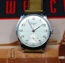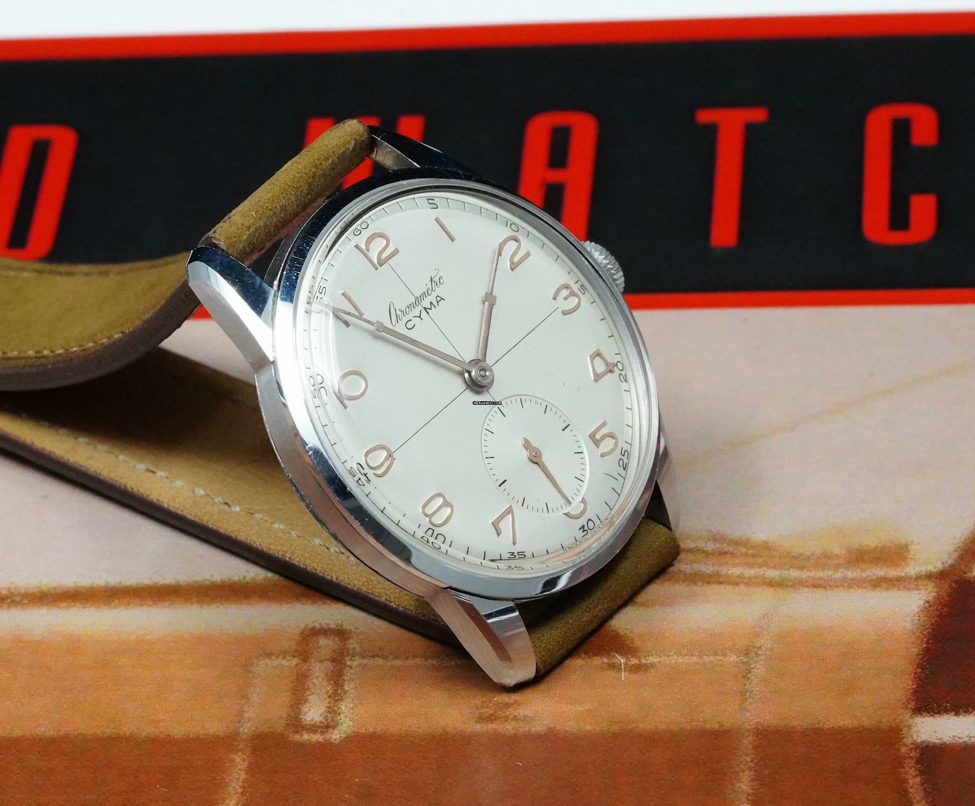 It's still possible to find super nice high quality vintage watches for a very fair price! In this case a minty and stunning Cyma Chronometre from around 1950. The original 'crosshair' dial on this example is truly exquisite with rose gold applied numerals and skyscraper hands. But it also the silver outer minute track is stunning and seems enamel print... The mint all steel, completely signed case measures 34mm excl. crown. But the true gem lies beneath the dial and caseback! It's a Cymal Cal 216 high quality Chronometre rated movement with Geneva stripes and top finish. Attached is a period style strap matching the numerals and hands. Where can you find a Chronometre with similar looks and quality for such a price?