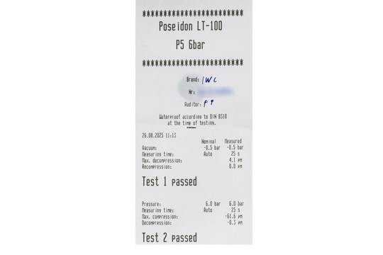 - Wasserdichtigkeit*: ja. Das Prüfprotokoll mit Prüfdruckangabe liegt bei.