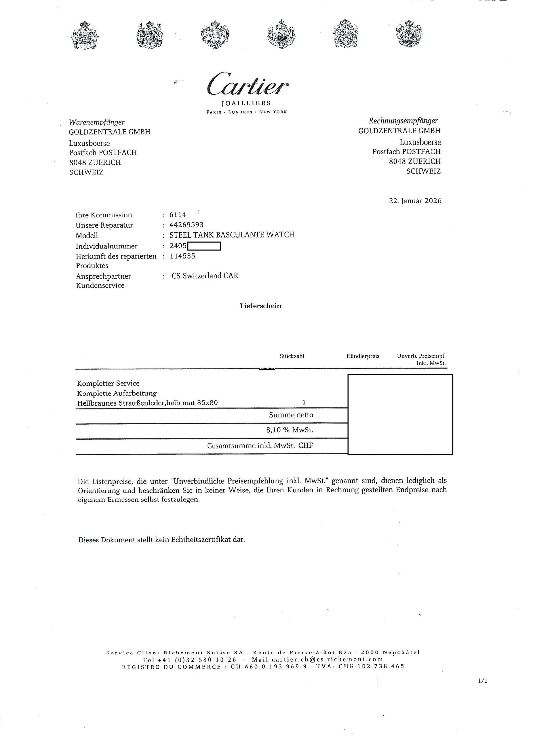 Papers: service papers from Cartier