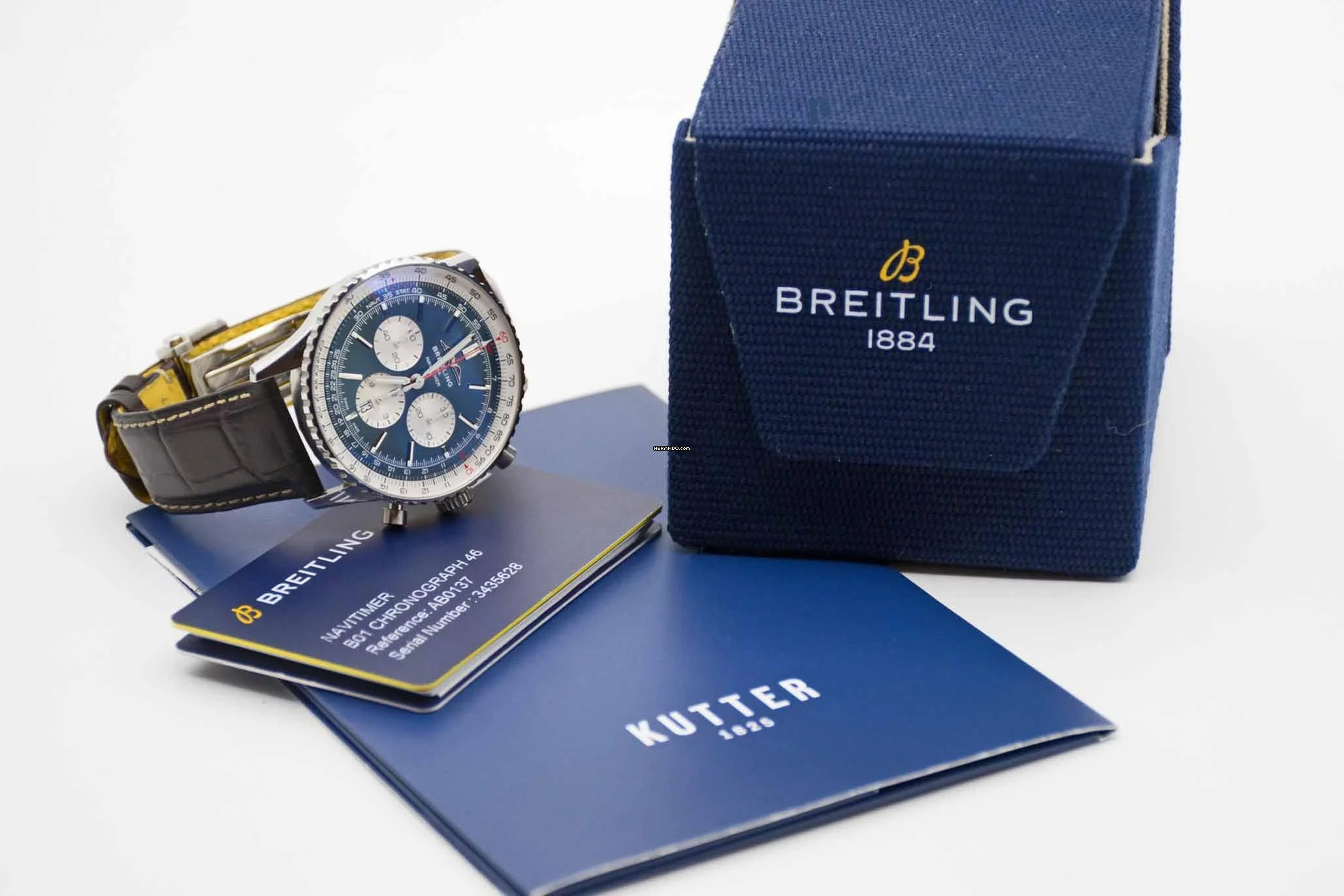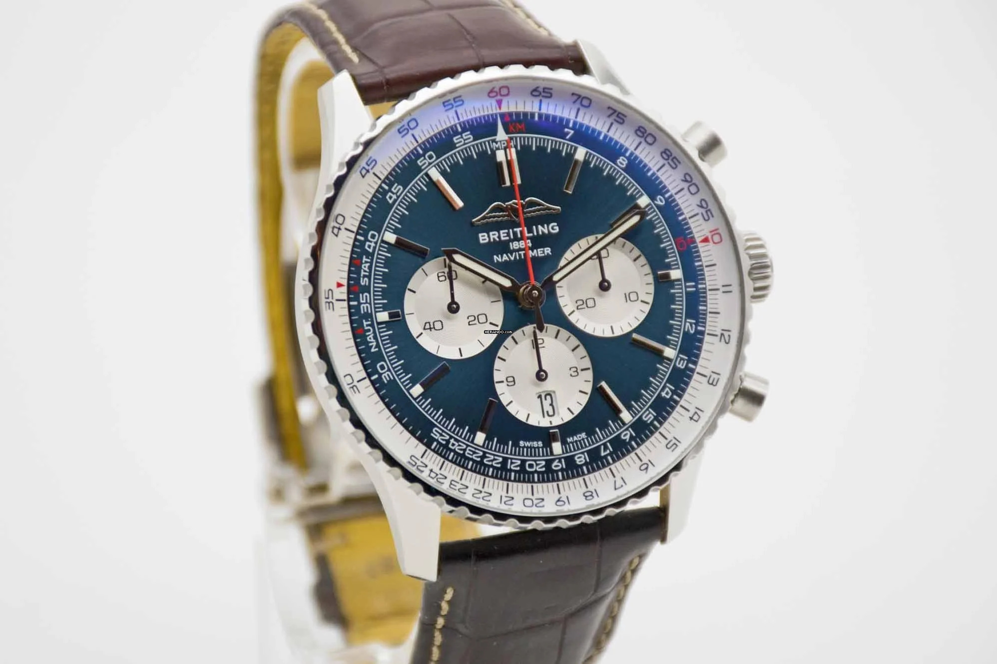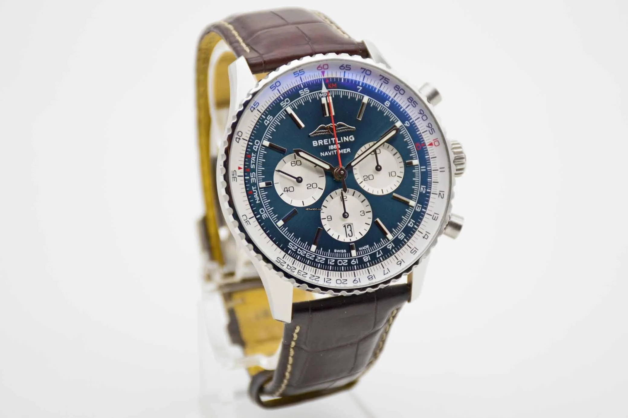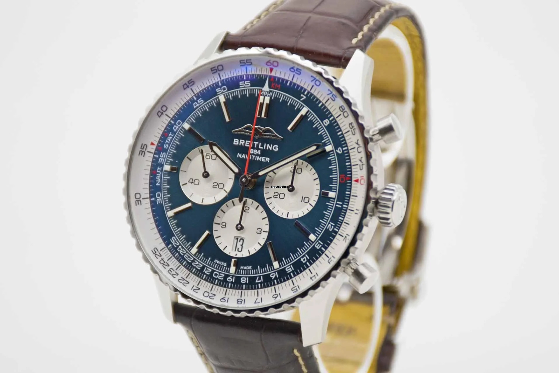Navitimer B01 Chronograph 46 Referenz AB0137211C1P1, 46 mm Gehäuse mit blauem Zifferblatt und dunkelbraunem Breitling Kroko Armband mit Breitling Faltschließe. Wunderschöner Chronograph in Breitling PET Box, mit Anleitung, Erstkaufrechnung (Breitling Boutique Stuttgart) und Breitling Garantiekarte aus 12/2023 (Breitling Garantie 12/2028). Dieser 46 mm Navitimer wurde nur wenig getragen und befindet sich in perfektem und neuwertigem Zustand. Inzahlungnahmen sind nur bei direktem Kontakt möglich. Navitimer B01 Chronograph 46 Reference AB0137211C1P1, 46 mm case with blues dial and dark brown Breitling alligator strap with Breitling folding clasp. Perfect fullset in blue Breitling PET box, with manual, original Breitling purchase invoice (Breitling Boutique Germany) and original Breitling warranty card from 12/2023 (Breitling warranty valid up to 12/2028). The watch is in perfect and mint condition like new. Trades are possible at Herando.