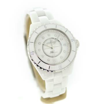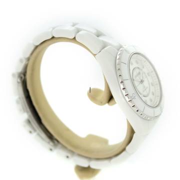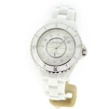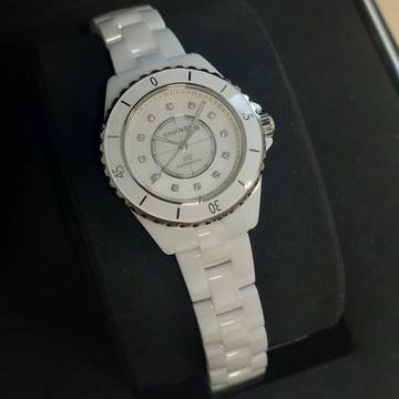 This Chanel watch features a 33 mm ceramic case. The watch features a white dial with diamonds. The watch is equipped with a white ceramic strap.
