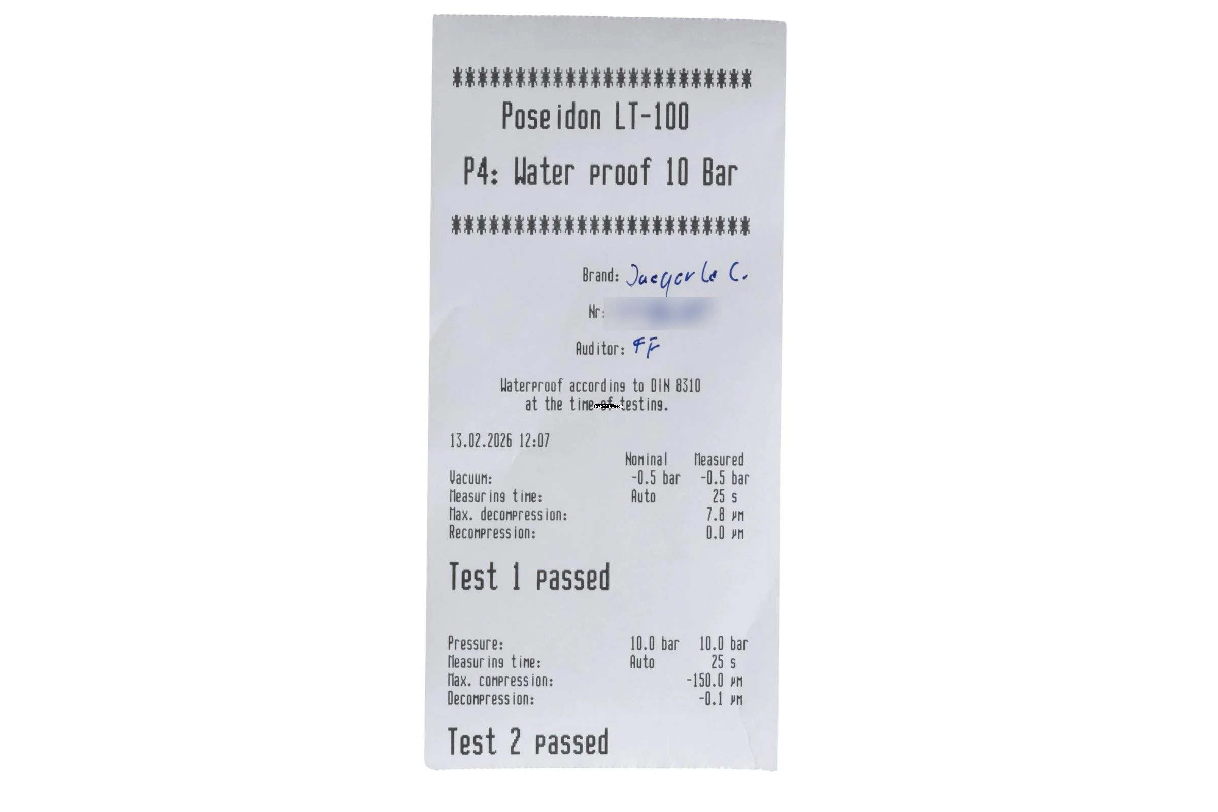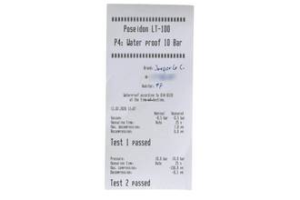 * Wenn die Uhr positiv auf Wasserdichtigkeit getestet wurde, dann gilt diese Eigenschaft zum Zeitpunkt der Messung. Wasserdichtigkeit ist nach DIN 8310 keine bleibende Eigenschaft. Sie sollte jährlich und vor besonderen Belastungen überprüft werden, da die eingebauten Dichtelemente in ihrer Funktion und im täglichen Gebrauch nachlassen. Einflüsse wie starke Temperaturschwankungen, Chlor, Seife oder Salzwasser wirken sich negativ auf die Wasserdichtigkeit aus.