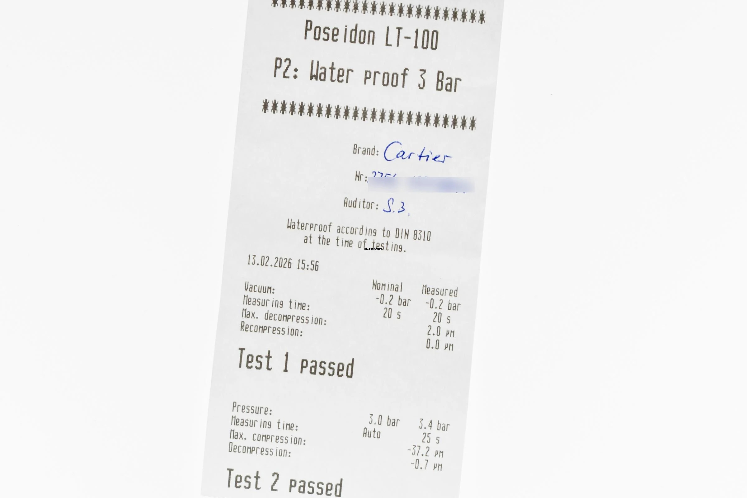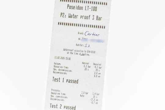 * Wenn die Uhr positiv auf Wasserdichtigkeit getestet wurde, dann gilt diese Eigenschaft zum Zeitpunkt der Messung. Wasserdichtigkeit ist nach DIN 8310 keine bleibende Eigenschaft. Sie sollte jährlich und vor besonderen Belastungen überprüft werden, da die eingebauten Dichtelemente in ihrer Funktion und im täglichen Gebrauch nachlassen. Einflüsse wie starke Temperaturschwankungen, Chlor, Seife oder Salzwasser wirken sich negativ auf die Wasserdichtigkeit aus.