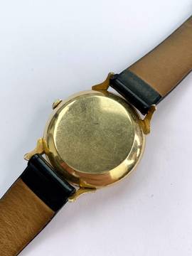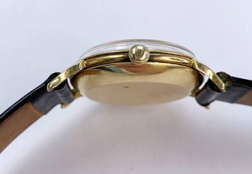 Entry-level model. The watch dial has a unique design. On the one hand, it has both numbers and "sticks" as indices. It also has a rare and beautiful, inwardly offset minute track. The watch has a 16 mm lug width. The case is gold plated, but looks like solid gold, as the caseback color is golden.