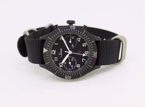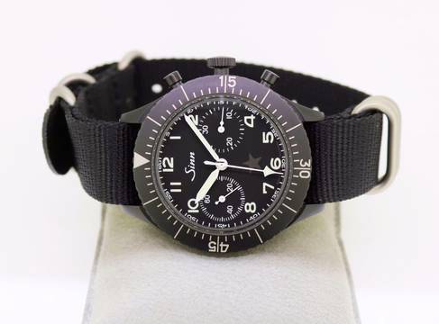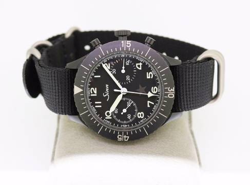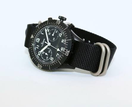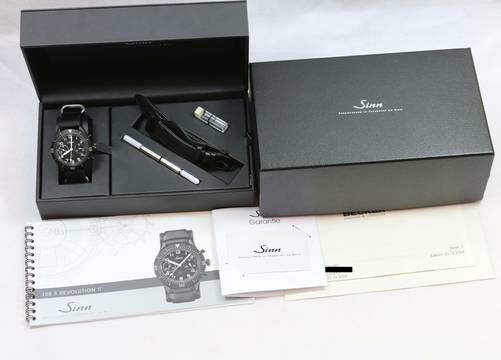 Sinn Chronograph, original Sinn Garantiekarte, Kopie der original Kaufrechnung, Beschreibungsheft, Textilband und BW-Lederband, original Box mit Umkarton (siehe orig. Foto).