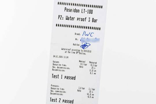 * Wenn die Uhr positiv auf Wasserdichtigkeit getestet wurde, dann gilt diese Eigenschaft zum Zeitpunkt der Messung. Wasserdichtigkeit ist nach DIN 8310 keine bleibende Eigenschaft. Sie sollte jährlich und vor besonderen Belastungen überprüft werden, da die eingebauten Dichtelemente in ihrer Funktion und im täglichen Gebrauch nachlassen. Einflüsse wie starke Temperaturschwankungen, Chlor, Seife oder Salzwasser wirken sich negativ auf die Wasserdichtigkeit aus.