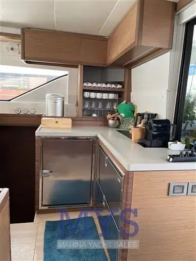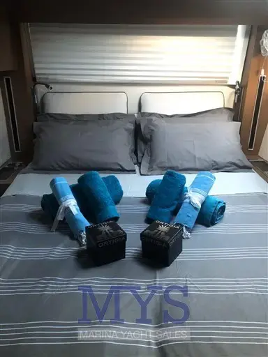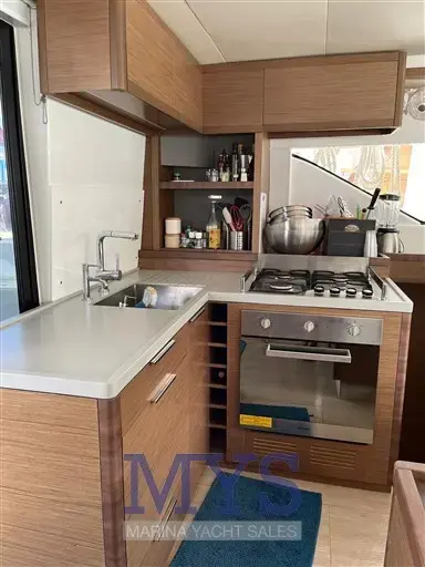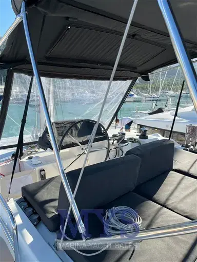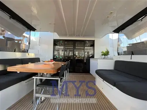 "This catamaran fits between the indisputable 450 and 52, offering a seductive alternative to sailors looking for a large "marine and modern" owner's boat. The 50, with its visual identity, its type of rig and the hull design offers better performance together with a single line. In fact, the elegance of the 50 seduces for the beveled shape of the hulls, the generosity of the spaces and the panoramic view more than ever enhanced. Flybridge with two secure accesses and a wheelhouse that offers perfect visibility; Behind it, an immense modular space for relaxation whose lockers, well hidden, are extremely capacious to be able to store the cushions. A cockpit aft open to the sea, spacious and uncluttered transoms for easy access on board and a modular dinette with removable seats to accommodate smaller and larger families." EXCELLENT GENERAL CONDITIONS, + AGENCY COMMISSIONS. INTERIORS ELEGANCE LINE VERSION 5 CABINS, 5 Bathrooms, 2 Crew cabins with bathroom Fabric upholstery, leather and stainless steel accessories at the head of the bed and on the bedside tables, leather trim in the library and on the shelves of the living room, gray finish x kitchen furniture, Corian finish for the shower 3 Cabins on the left side, 2 on the right side Additional cabin in the centre left hull with double bed Dinette with sofa and dining table convertible into a bed Kitchen complete with gas burners, oven, fridge and dishwasher Miele 6 covers 220V Interior wooden floor INSTRUMENTATION AIS B&G 500 TRANSMITTER / RECEIVER Compass B&G Navigation Pack 2018 GPS ZEUS 12" AT THE CARTA EUROPA CHART TABLE GPS ZEUS 12" AT THE WHEELHOUSE ECHO SOUNDER B&G FORWARD VISION Log B&G 4G RADAR, WITH STAINLESS STEEL PROTECTION Autopilot B&G PILOT REMOTE CONTROL Electronic motor control VHF B&G RS90 AND DUAL WORKSTATION WITH ASN Electric windlass Chain counters 220V dock socket 2 Charger 60A and 40A INVERTER 12 / 220V - 2000W Internal sockets 12v Internal sockets 220v USB sockets in the saloon and cabins ANTENNA TV Courtesy lights Speakers Stereo Fusion 70 + 6 speakers in the lounge, cockpit and flybridge FANS FOR SALON AND CABINS Air conditioning AIR CONDITIONER CRUISAIR 64000 BTU 220V AIR CONDITIONER CRUISAIR 3500 BTU 220V IN THE FIFTH CABIN Reversible climate FREEZER 110 L IN THE HALLWAY FREEZER 110 L IN THE LOUNGE Autoclave Hot water boiler Black water system Black Water Tank WATERMAKER HP 230LT/H Fresh water intake at the quay Additional water tanks SX and DX 2 x 175 L Sea water/fresh water bridge washing pump Hydraulic gangway ARMAMENT Still Awning Complete cushions "DARK GREY" Stern cushions Bow cushions Fly cushions "GRAPHITE" COVER KIT (Rudder wheel, Wheelhouse Console) Sprayhood at the wheelhouse Sun towels Bow pulpits with wooden seats SLIDING GLASS ON THE FRONT OF THE DECKHOUSE Sliding entrance door Teak cockpit Cockpit table Outdoor shower Swimming ladder Stainless steel tender lifting system and manual winch Mainsail square top Ribbon Wrap Jib Spiroidal rigging Electric Winch for Right Maneuvers 50.2STAEH Staging and technical: Water pressure pump, Deck Shower, Tender Crane, Courtesy Lights, Gangway (idraulica), Automatic Bilge Pump, Manual Bilge Pump, Entry door (scorrevole), Teak Cockpit, Shorepower connector, Electric Windlass, Strand rigging, swimming ladder, cockpit table, Living Room Foldable Table. Domestic Facilities onboard: Warm Water System, Inverter Air Conditioning, Waste Water Plant, Interior wooden floor, 12V Outlets, 220V Outlets, Black Water Tank, Electric Toilet. Entertainment: Speakers, Hi-Fi. Sails accessories: Jib Furling System. Kitchen and appliances: Galley, Burner. Upholstery: Cushions, Stern Cushions, Bow Cushions, Fly Bridge Cuscions, Sunshade.