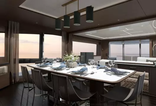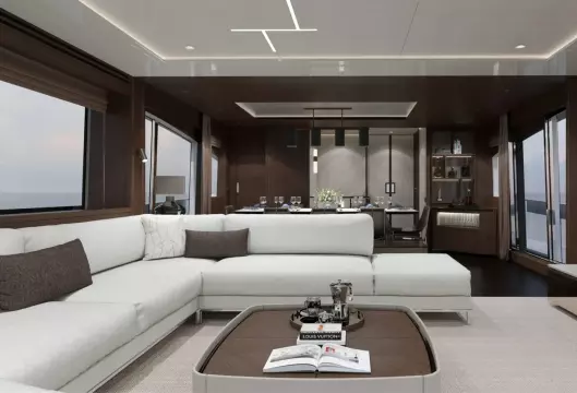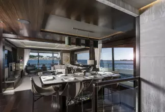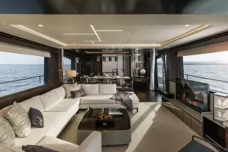 The extended bathing platform is perfect for carrying a tender with an optional flybridge crane for a jet ski or similar. The vast flybridge on the 88 Yacht enjoys a superb layout with beautifully appointed furniture on a spacious aft deck and the option of an infinity spa bath with a sun pad. It's a brilliant space for entertaining with ample places to sit and relax thanks to companion seating adjacent to the helm and extended U-shaped seating opposite a feature wet bar with ice maker, grill and two fridges or optional drawer-refrigeration. There is also the option for fixed stools to turn this into a social bar area. The teak foredeck features another private, social space with a large sunbathing area and comfortable lounge seating complemented by premium teak side decks as standard. The main deck is nothing short of spectacular.
