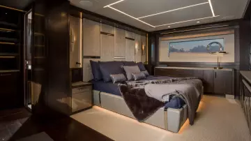 Inside, there is a large forward galley that maximises an open-plan entertainment space. Owners and crew can enjoy making use of ample practical storage space, as well as a dedicated fixed breakfast bar unit with two stools, creating an additional informal dining area. The galley has a full-height premium fridge freezer and dishwasher as standard with space for wine coolers. There is also the ability to fully close off the galley, allowing the crew to move around the yacht unnoticed with access from the lower helm on the starboard side that gives owners the chance to enjoy complete privacy. The interior exudes luxury and has clever design cues throughout that make the yacht stand out, including diagonal stainless detailing on cabinetry and doors. The layering of textural elements and the mix of furnishings and fabrics feels timeless with a modern twist with a range of colours and finishes available. Sunseeker has located the grand master stateroom central to the yacht, making the most of her substantial beam to maximise this private space. The master stateroom, with its 55" TV as standard, enjoys a spacious dressing area with a double wardrobe and adjacent in the en suite featuring exquisite surfaces throughout are double sinks, an overhead rain shower and plentiful stowage.