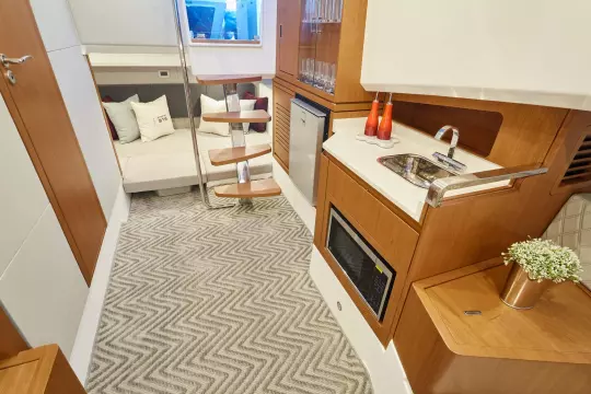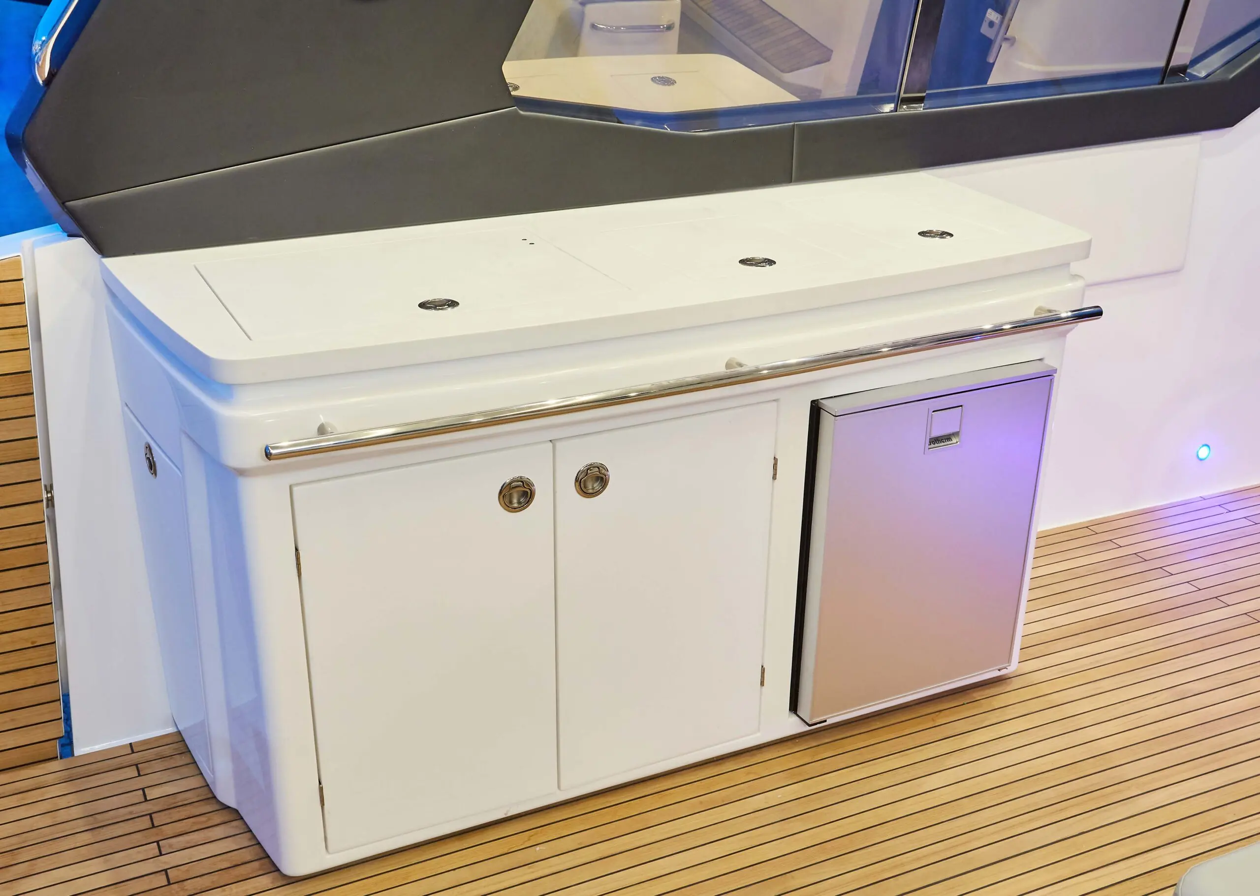 - Flexible Deck Layouts: Customize your space with options for a gourmet station, featuring a grill at the stern, or enjoy a sunpad and bench seating for relaxation and entertainment.