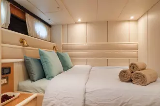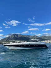 Electric winch with deck, and cockpit controls, bimini top, Helm cover, bow cushions, hydraulic passerelle, deck shower, tender garage with Avon dinghy, wet bar with fridge.