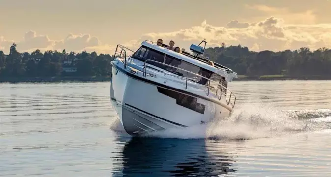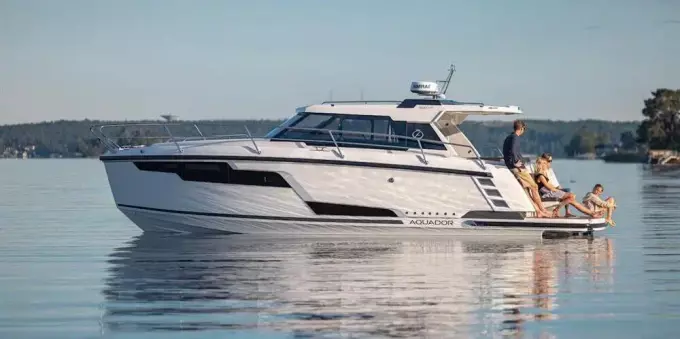 The Aquador 300HT is a remarkable model of boat, boasting the latest in innovative features, modern technology and sleek Scandinavian design. Featuring an 'AquaDynamic' hull which allows it to cut through the water effortlessly, this stunning 9.35 metre vessel also boasts a hard top roof for shade, as well as a sunbathing area and plenty of seating. Available in both stern-powered and outboard engine-driven versions, the 300HT provides all the attributes of a larger yacht in a more practical and charming package. With safety for those onboard and those sharing the water always a priority, you and your loved ones can experience the joy of a day at sea or a more extended adventure with confidence and trust.