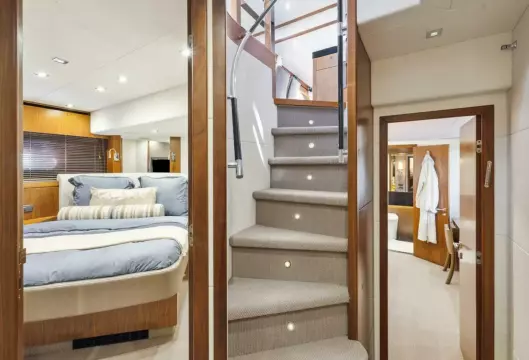 Thoughtfully crafted to the finest detail, large hullside windows allow natural light to sweep through and show off the fine furnishings and delicate details that feature throughout. On the secluded lower deck, guest accommodation can sleep up to eight guests in sublime comfort. The flybridge on the other hand is far from secluded. Undoubtedly this yacht’s centerpiece, it’s just one of the many refinements that make this magnificent motoryacht demand attention in any waters.