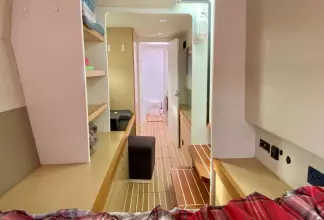 Three cabins, each with dedicated heads and shower. Master cabin in port hull with large owner berth, dressing area and spacious heads and shower room forward. Two double cabins in starboard hull, each with en-suite heads and shower. Seating in the saloon converts easily into a large double berth.Beautiful layout and fit for this ultralight performance cruiser. Ample storage space for extended cruising and entertaining
