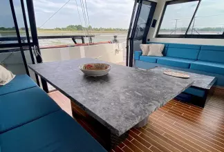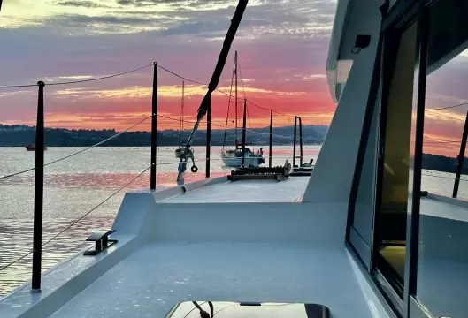 Underway, the connection between the galley and the saloon means that the crew can enjoy wonderful dining without compromise in complete control and safety. At anchor, the sliding windows and doors and opening roof bring the outside in and offer the most comfortable outside sitting space available on any catamaran of this size.