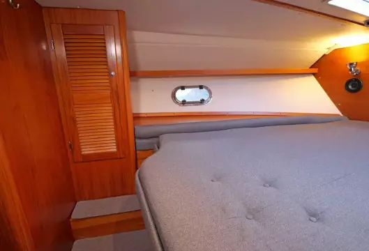 Shelved storage locker beneath aft end of bunk, accessible with double doors.