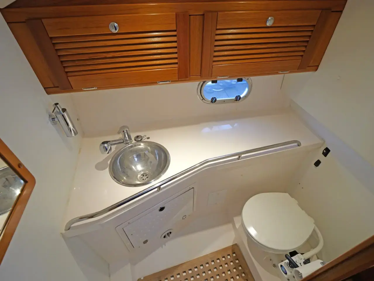 Forward-facing Jabsco marine toilet at the aft end, inboard.