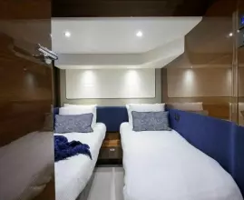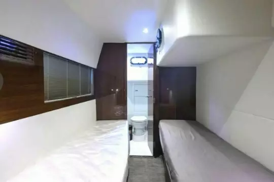 - Crew cabin aft, white hull, underwater lights, and allure package.
