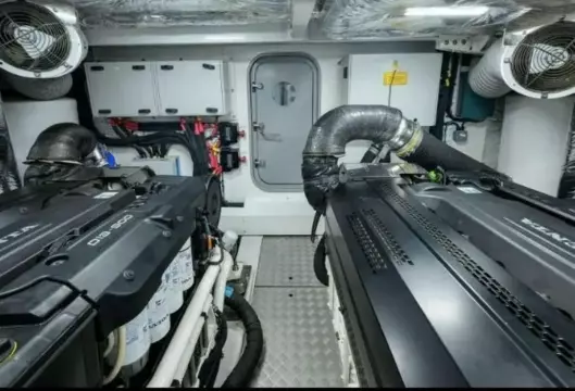 One of the standout features of this yacht is its thoughtful layout, which includes three luxurious staterooms and an additional aft crew cabin, providing ample accommodation for guests and crew alike. The spacious flybridge offers panoramic views and is equipped with state-of-the-art Raymarine Electronics, ensuring smooth navigation and enhanced safety on the water.
