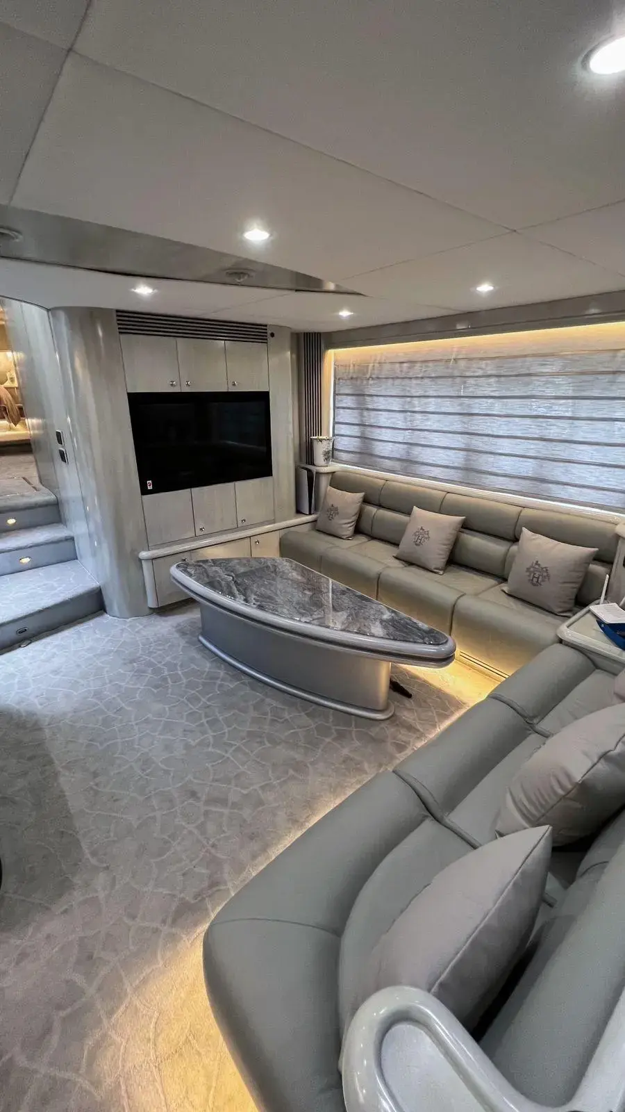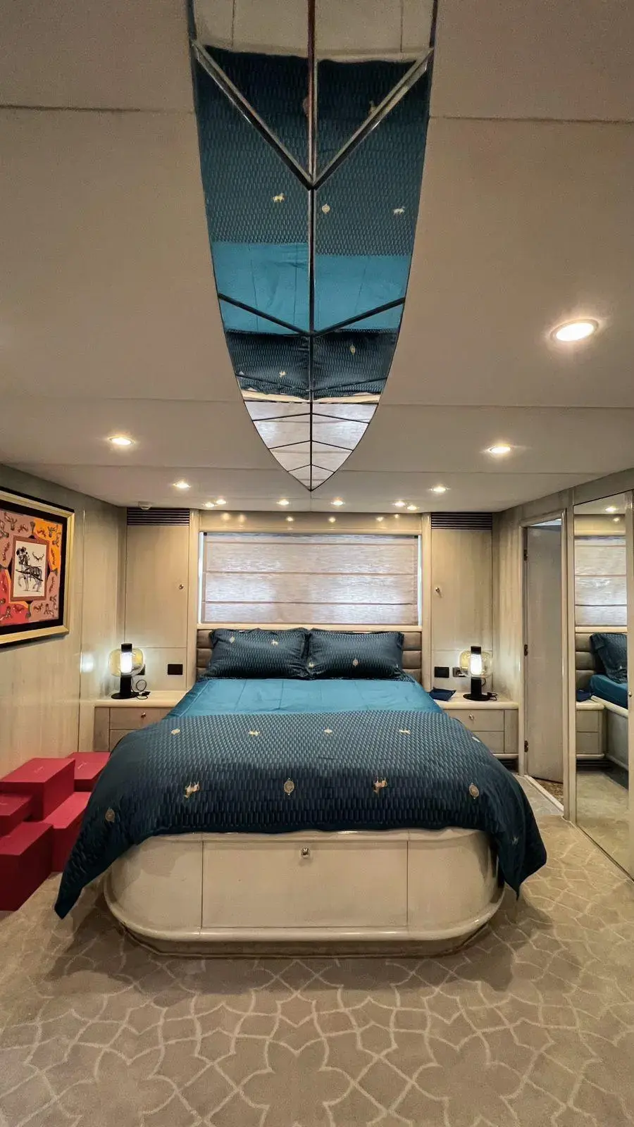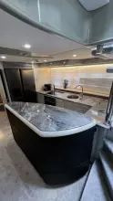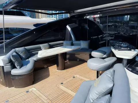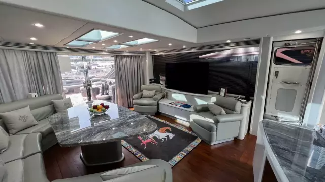 The Sunseeker Predator 95 “Full respray 2021” offers a huge living area created by the seamless blending of the deck saloon into the extensive aft cockpit. Outdoors, the aft deck beach club, which can be accessed via sliding glass doors from the main level salon, includes a settee, a U-shaped lounge and table for al fresco dining, and oversized sunpads for catching some rays. The Sunseeker Predator 95 also has a lighting/sound system that transforms the space into a starlit disco so you can dance the night away. For a tranquil escape, there is a large sunpad and sofa on the bow.