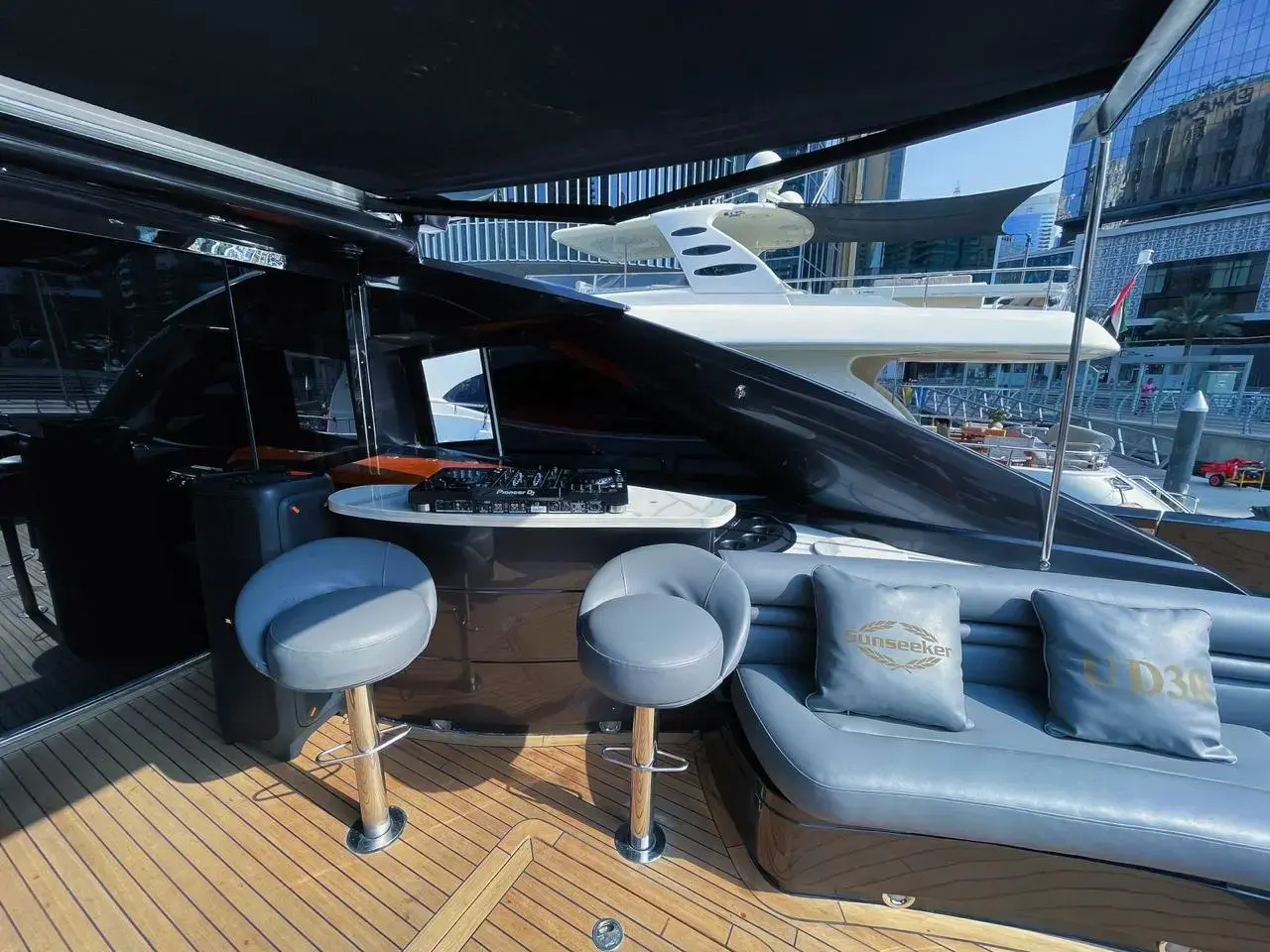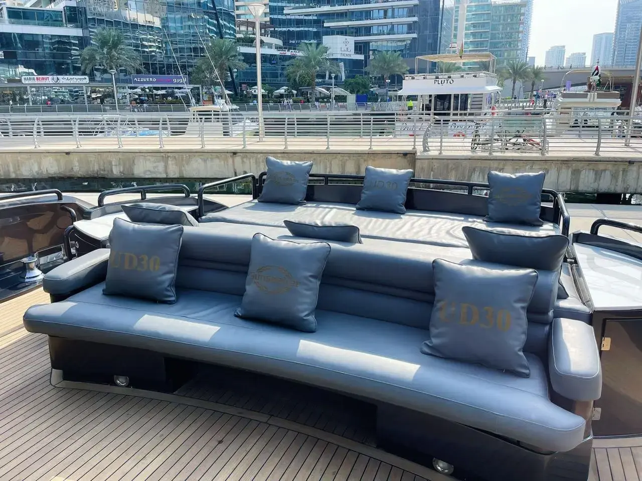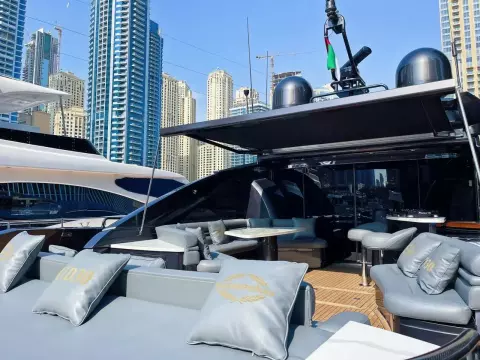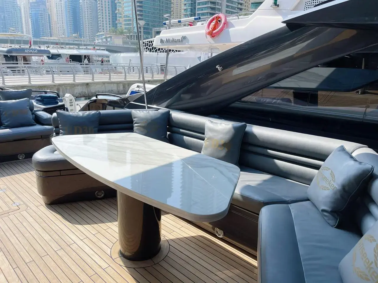 The Sunseeker Predator 95 “Full respray 2021” offers a huge living area created by the seamless blending of the deck saloon into the extensive aft cockpit. Outdoors, the aft deck beach club, which can be accessed via sliding glass doors from the main level salon, includes a settee, a U-shaped lounge and table for al fresco dining, and oversized sunpads for catching some rays. The Sunseeker Predator 95 also has a lighting/sound system that transforms the space into a starlit disco so you can dance the night away. For a tranquil escape, there is a large sunpad and sofa on the bow.