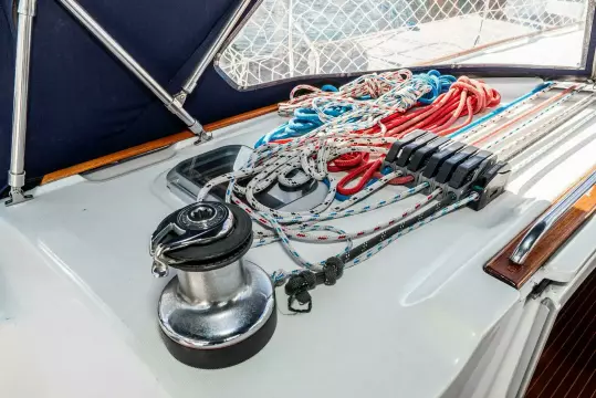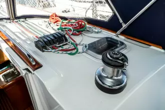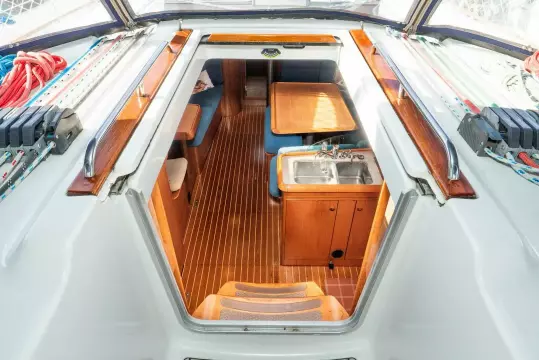 AccomodationsThe first thing you notice when going below is the abundance of rich/warm teak. The joinerwork is consistently good. This three cabin layout has Port & Starboard Double Aft Cabins and a large V-berth (custom latex mattress) in the forward Cabin with ensuite head. The guest head is just aft of midship to Port along with the Navigation Station and extra seating. There is a large raised U-shaped Settee around the Teak Table in the Saloon to Starboard. The large/well-laid out galley includes dual air cooled fridge compressors.
