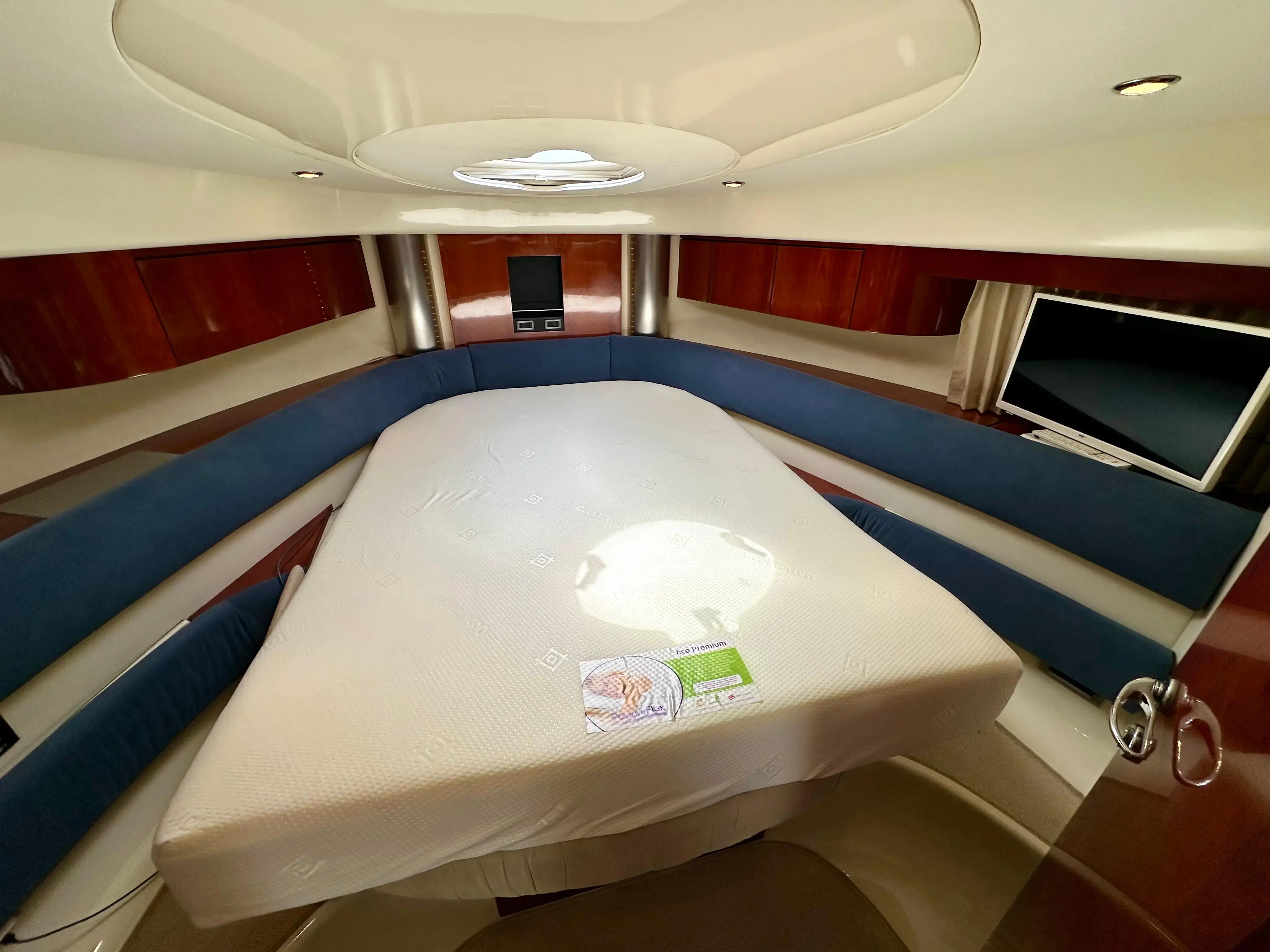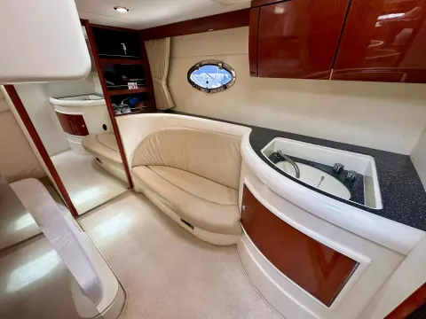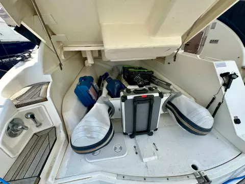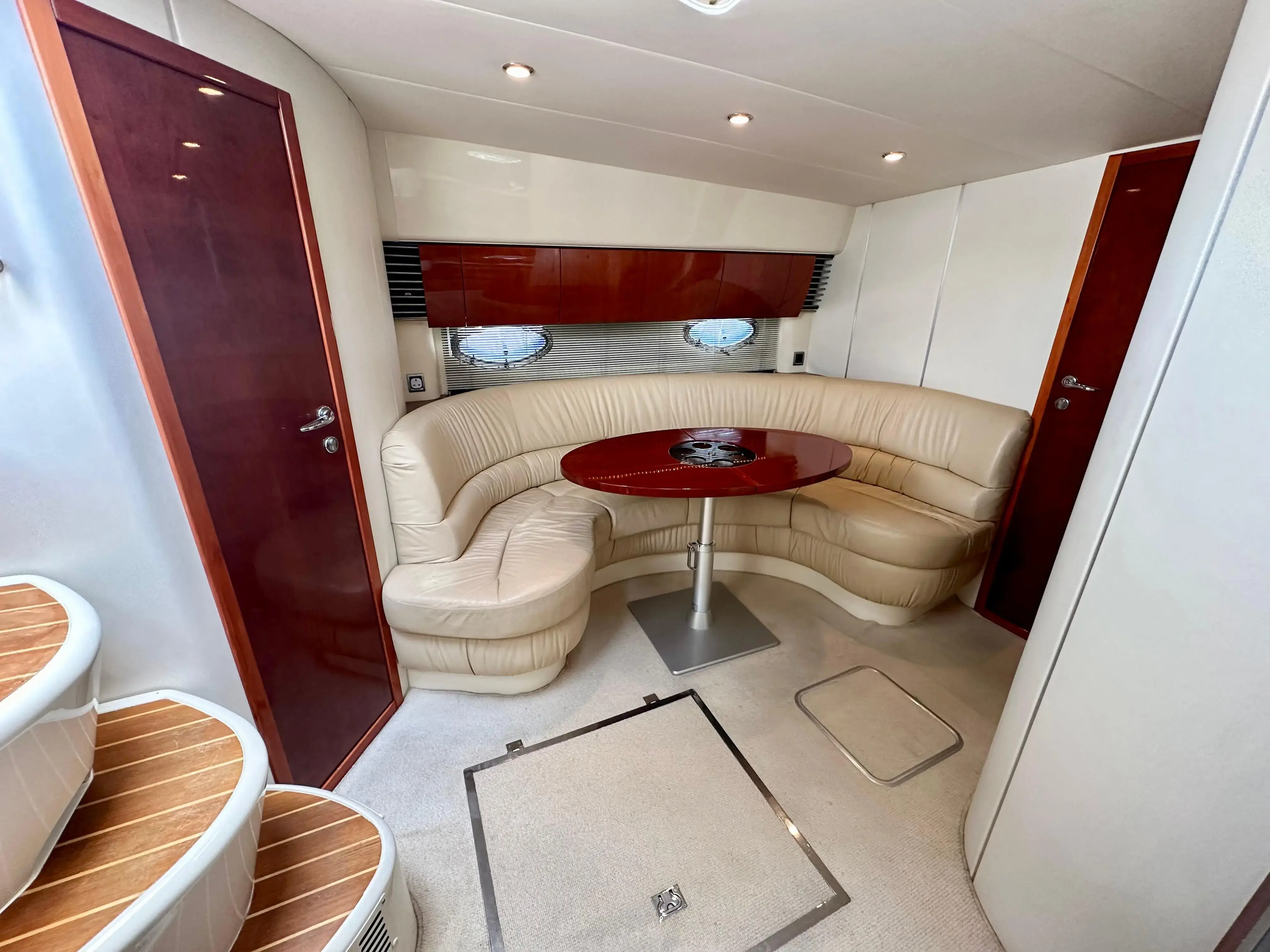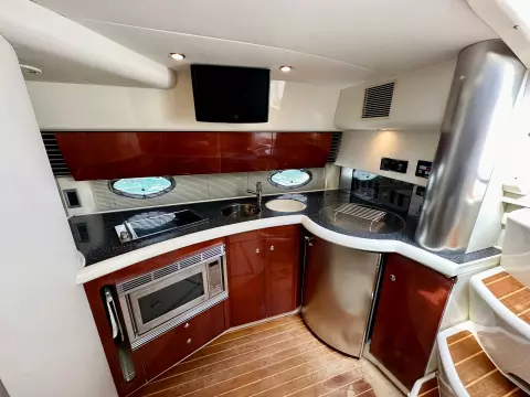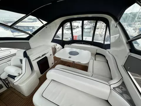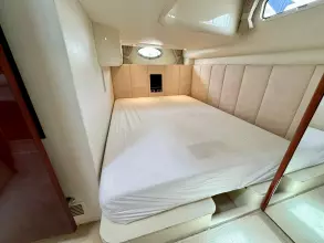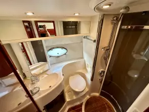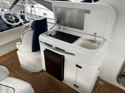 The spacious aft deck is perfect for entertaining, complete with a comfortable seating area, sun pads, and a wet bar. The teak-laid swim platform and cockpit add a touch of luxury and provide easy access to the water.