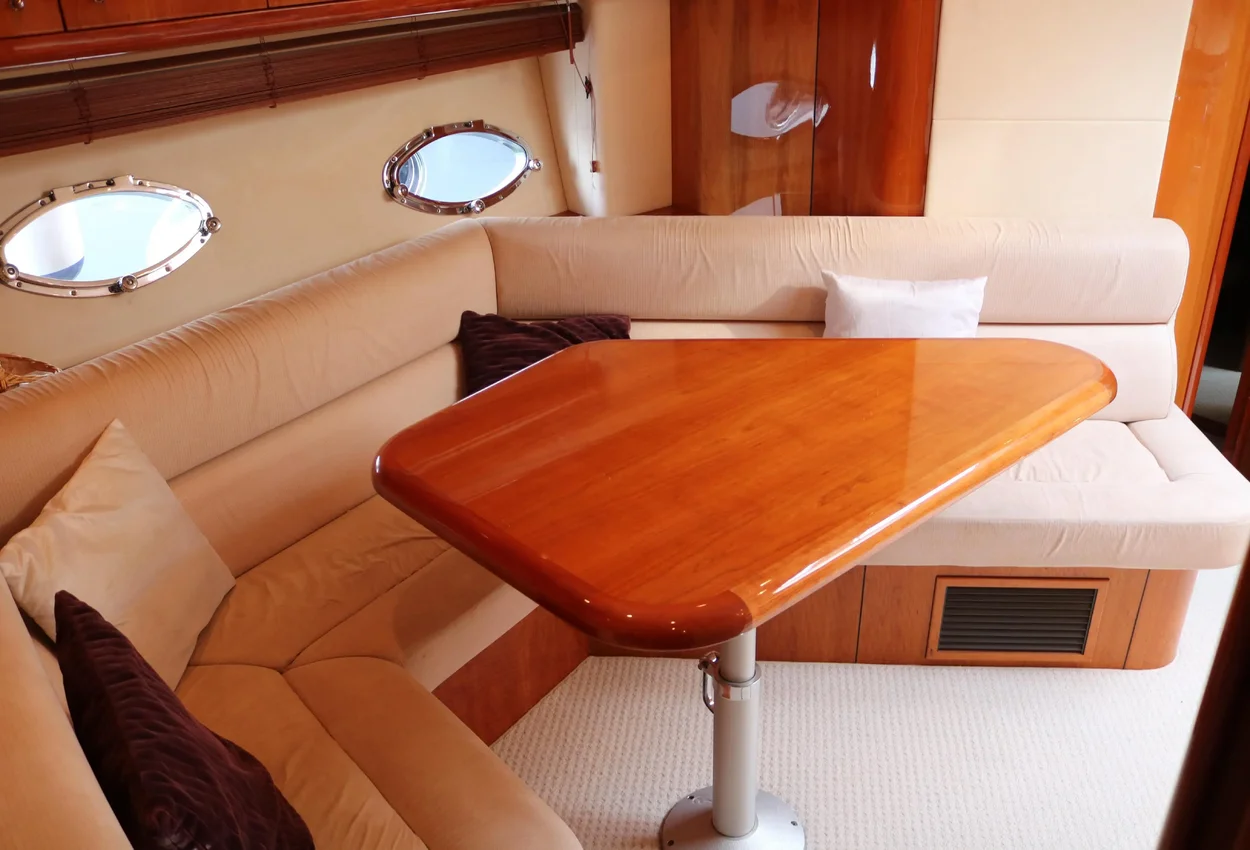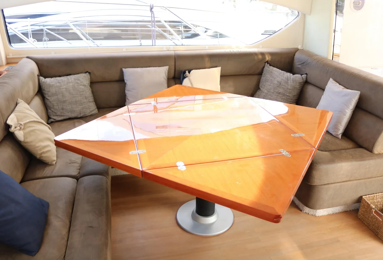 Large open plan saloon with a large opening table, surrounded by 'C' shaped seating